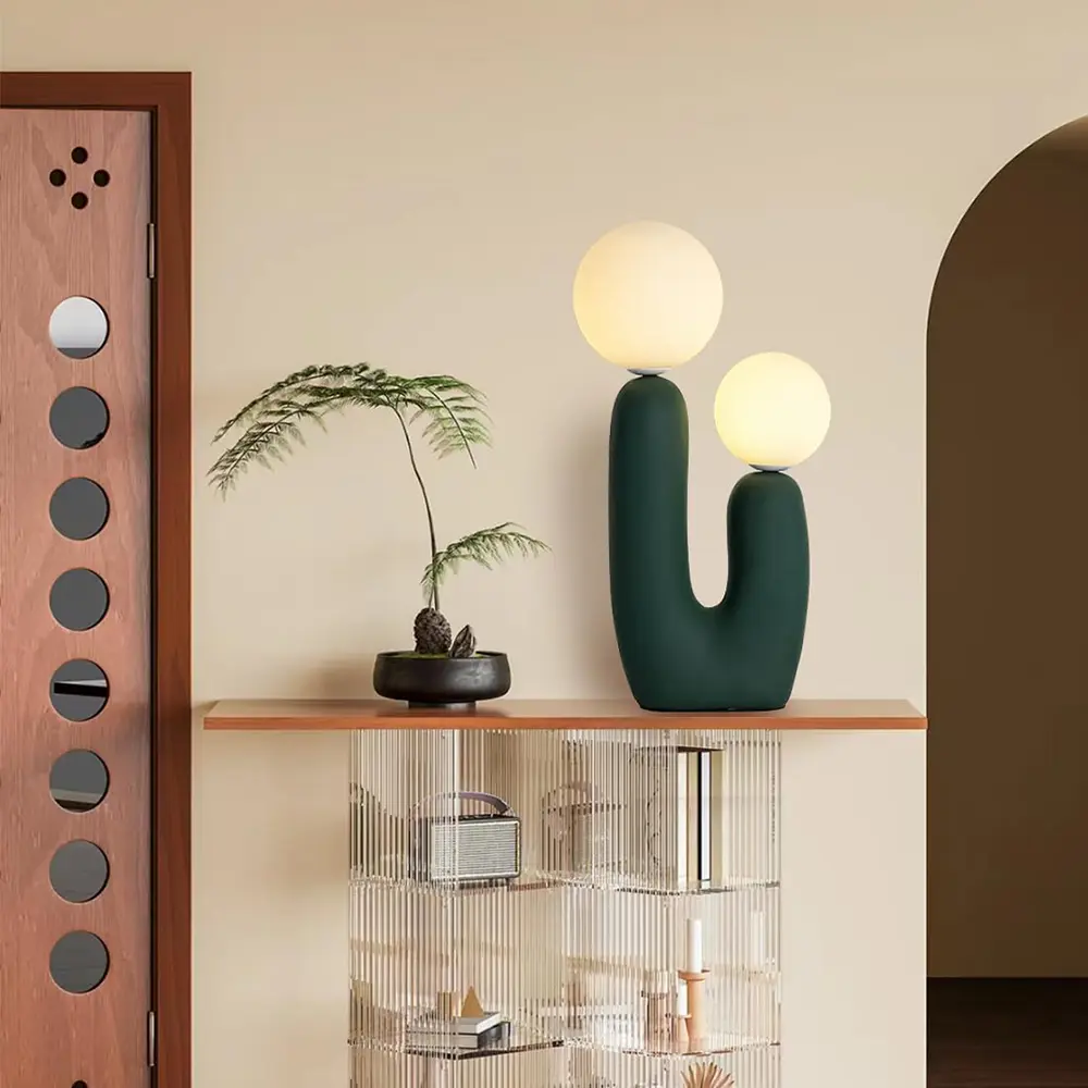 This table lamp is designed in a unique cactus shape, with a green lamp body and two round milk white glass lampshades, showing a creative, cute, special and modern style. Suitable for placement in bedrooms, study rooms, living rooms, etc., adding a unique artistic touch to your space. The night lamp body is made of strong and durable resin material, and the lampshade is made of light and transparent acrylic material. Combined with colorful design, it presents a fashionable and elegant appearance.