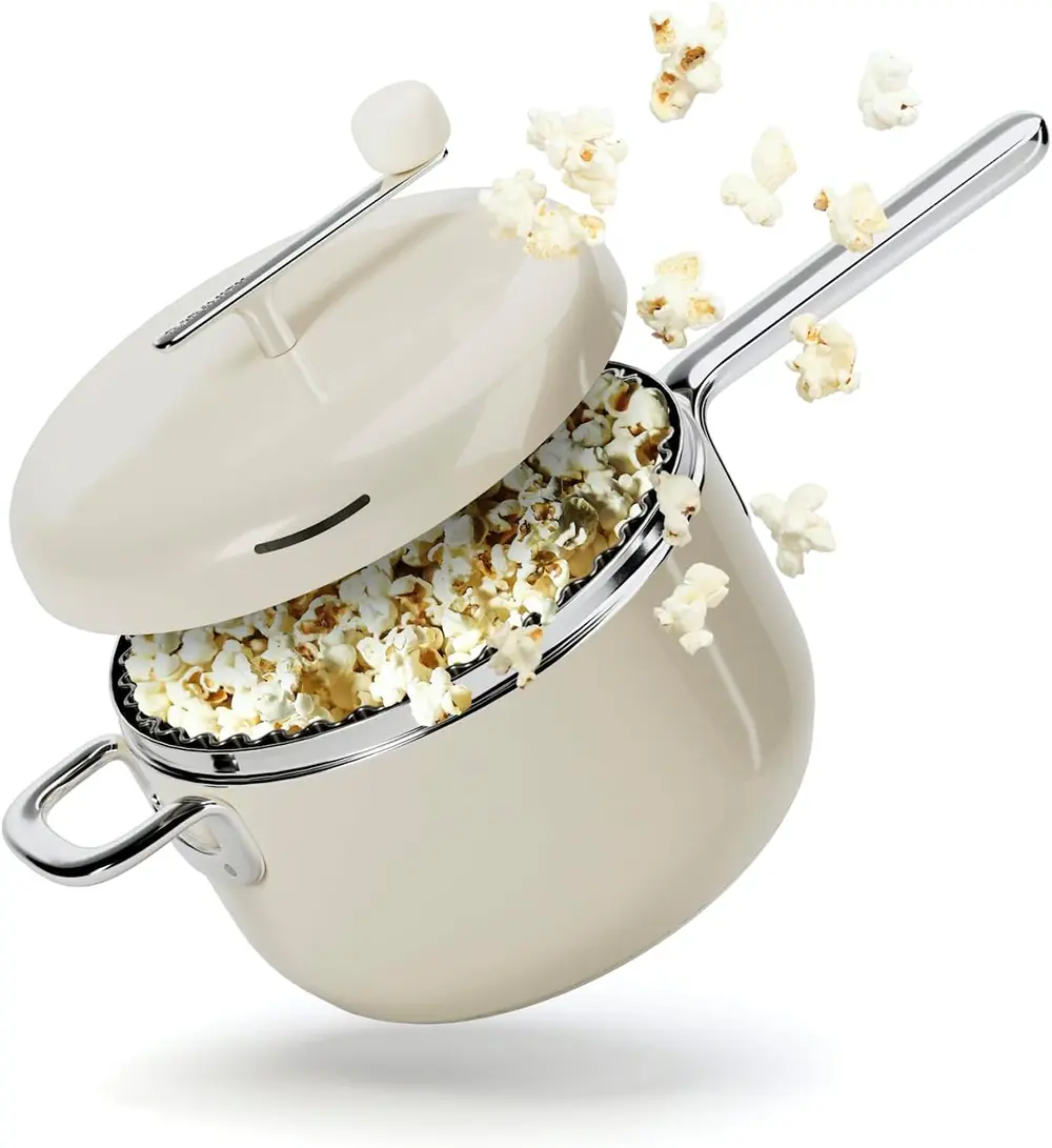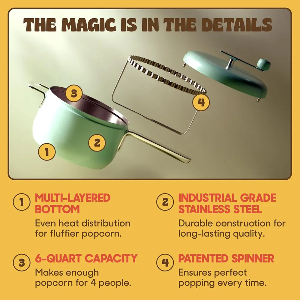 This stovetop popcorn pan is all about durability and control. Die-cast metal gears power a patented stirring system that constantly moves the kernels for even popping. The removable lid with quick-release clips makes cleanup easy—just wipe it down and store it away.