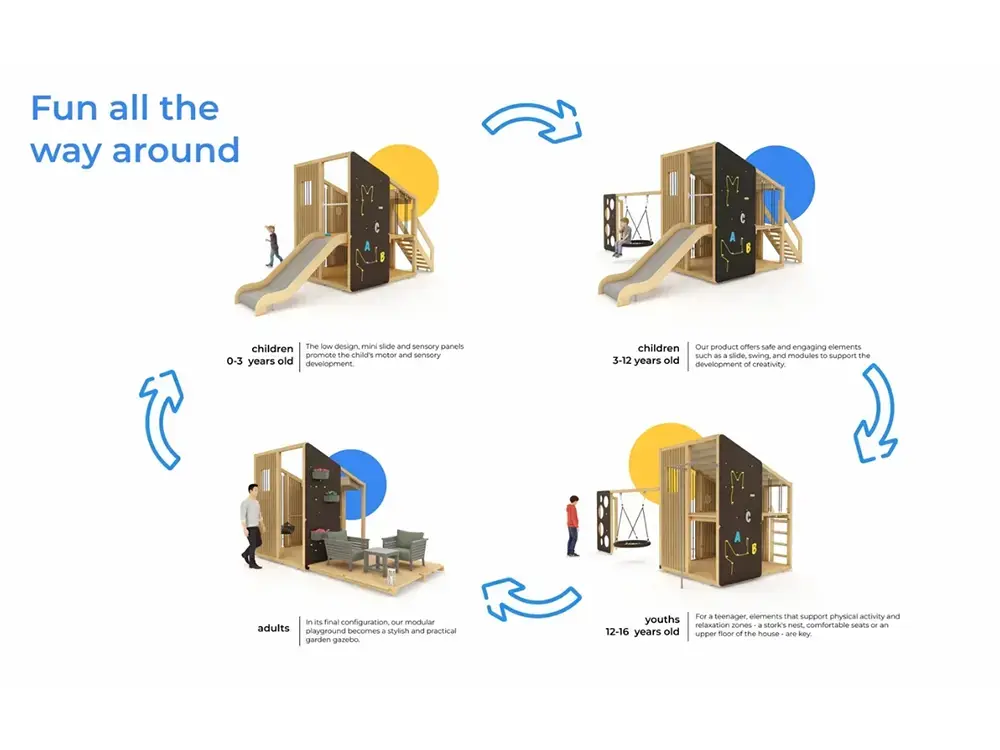 Winning a prestigious EPDA (European Product Design Award) is no small feat, and this collection earned its trophy by treating playground design like high-end architecture. Instead of just “background infrastructure,” Nolmo Garden is a masterclass in circular design. The big idea? Every single part is modular and easily replaceable. No more tearing out an entire structure just because one panel is worn out—you just swap the part and keep the fun going!