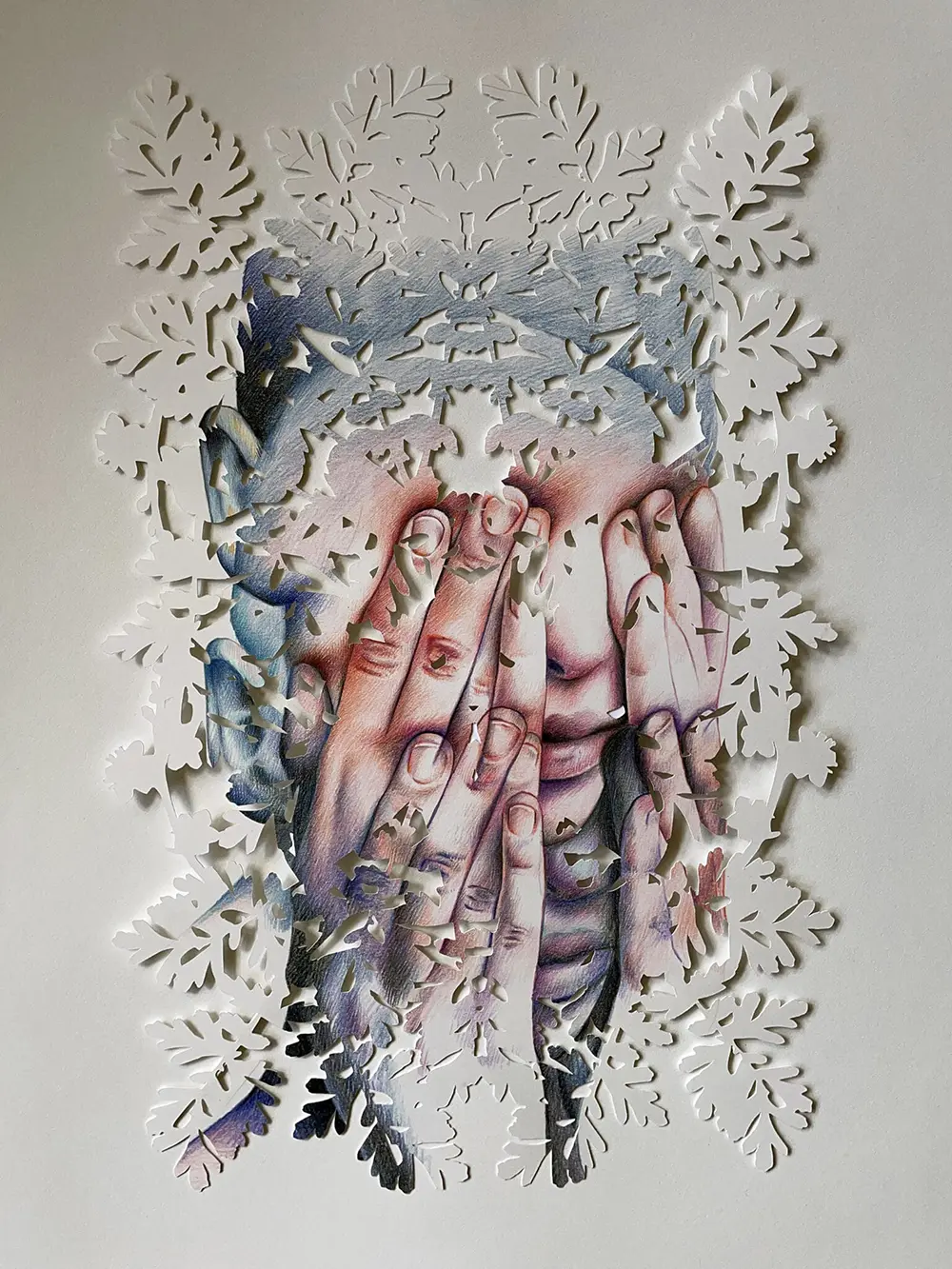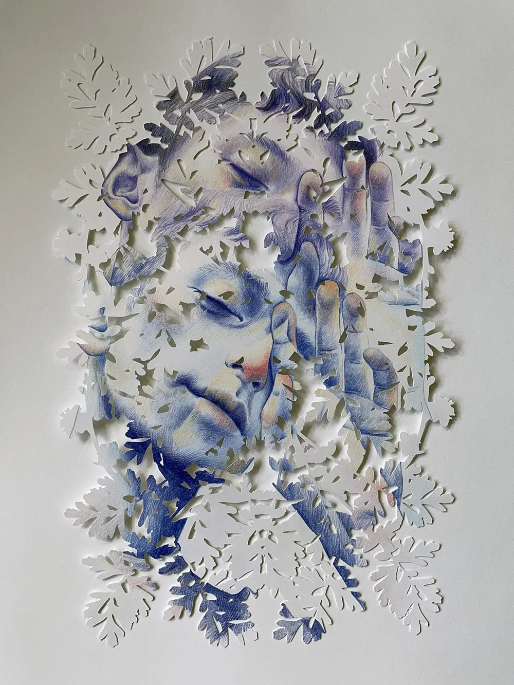 Imagine peeking through a tangle of leaves and catching just glimpses of someone’s face. That’s the world Toronto-based artist Christine Kim invites us into with her ethereal portraits. Using mixed-media collages, Kim layers textured graphite, gradients, and delicate cutouts to create faces and hands that emerge from—or disappear into—a web of foliage.