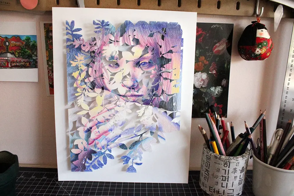 Kim starts each piece by illustrating a figure—some of her subjects include models Yuka Mannami and Hoyeon Jung—and then digitally draws matching botanical motifs. Using a Silhouette Cameo machine, she carefully cuts each layer and builds the portraits sheet by sheet. The results are graceful, surreal, and endlessly intriguing: fractions of faces and hands duplicated or filtered through webs of stems, leaves, and color.