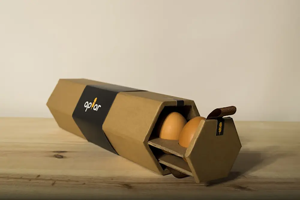 This student project reimagines egg cartons with a hexagonal shape, inspired by beehives. The unique design makes transport and storage easier while holding six eggs securely. It even has two clever openings, front and back, sealed with a tape strip. [source ]