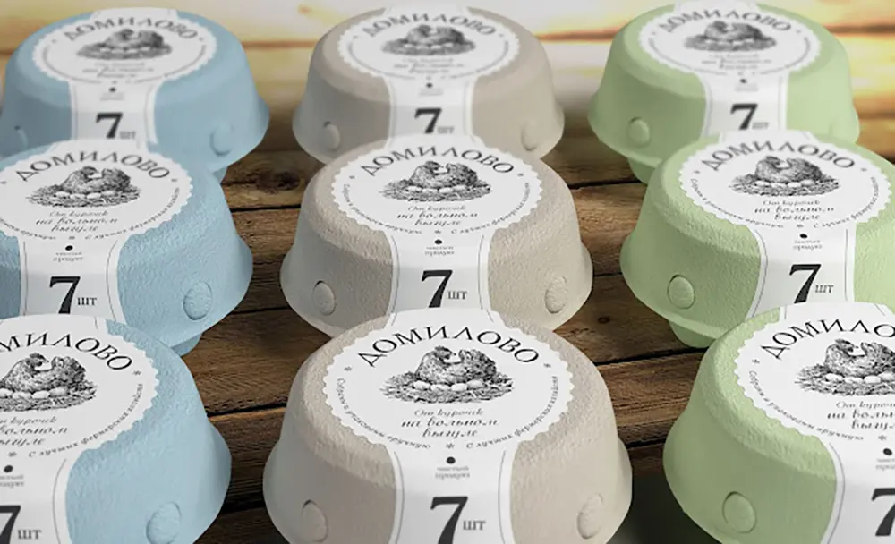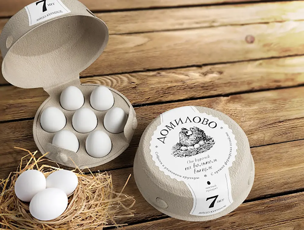 Made of eco-friendly pressed cardboard, Domilovo’s packaging is sturdy and sustainable. The unique henroost-inspired design fits seven eggs tightly, protecting them while giving off a wholesome farm feel. [source ]