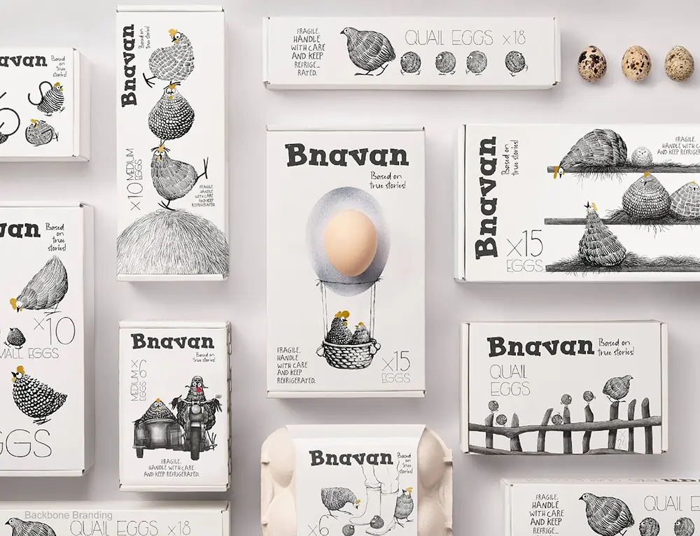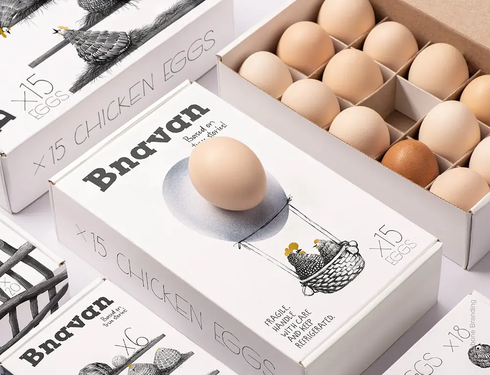 Bnavan brought personality to their cartons by turning hens into playful, adventurous characters. The packaging tells little farm stories through illustrations, making the eggs feel fun and family-friendly. [source ]