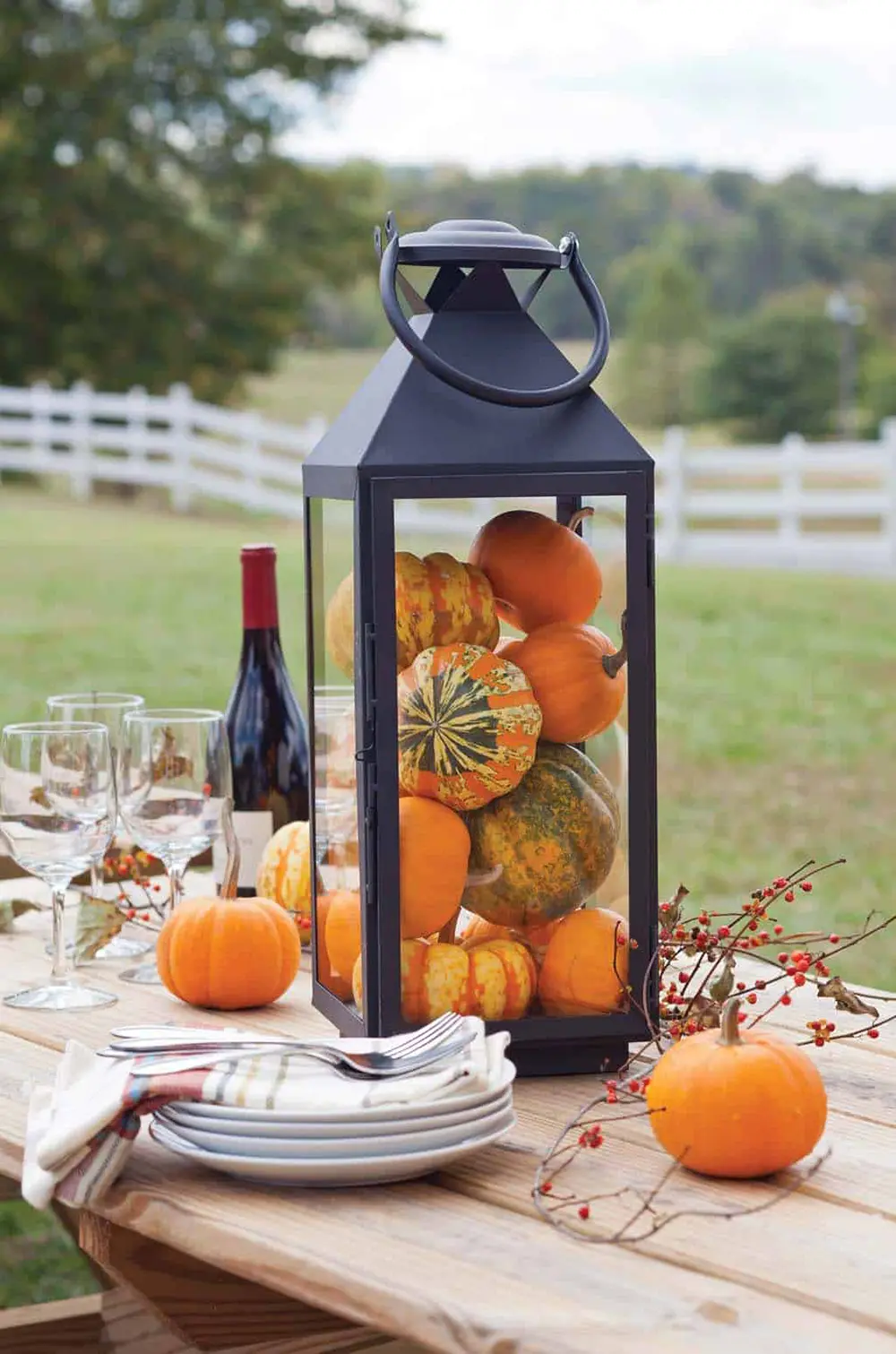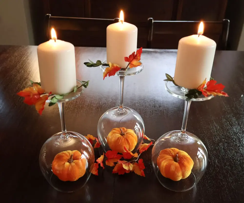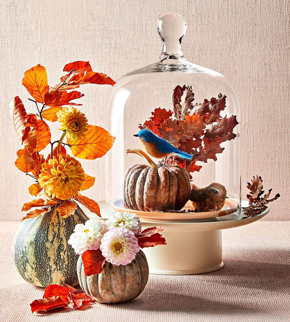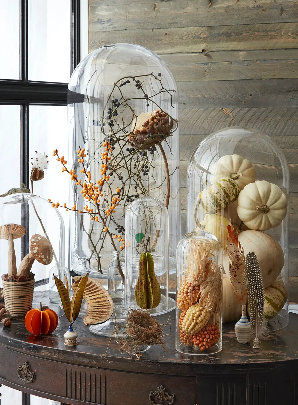 - Cloches with candles and pumpkins: Place glowing candles and tiny pumpkins under a glass cloche for a little autumn storybook scene.