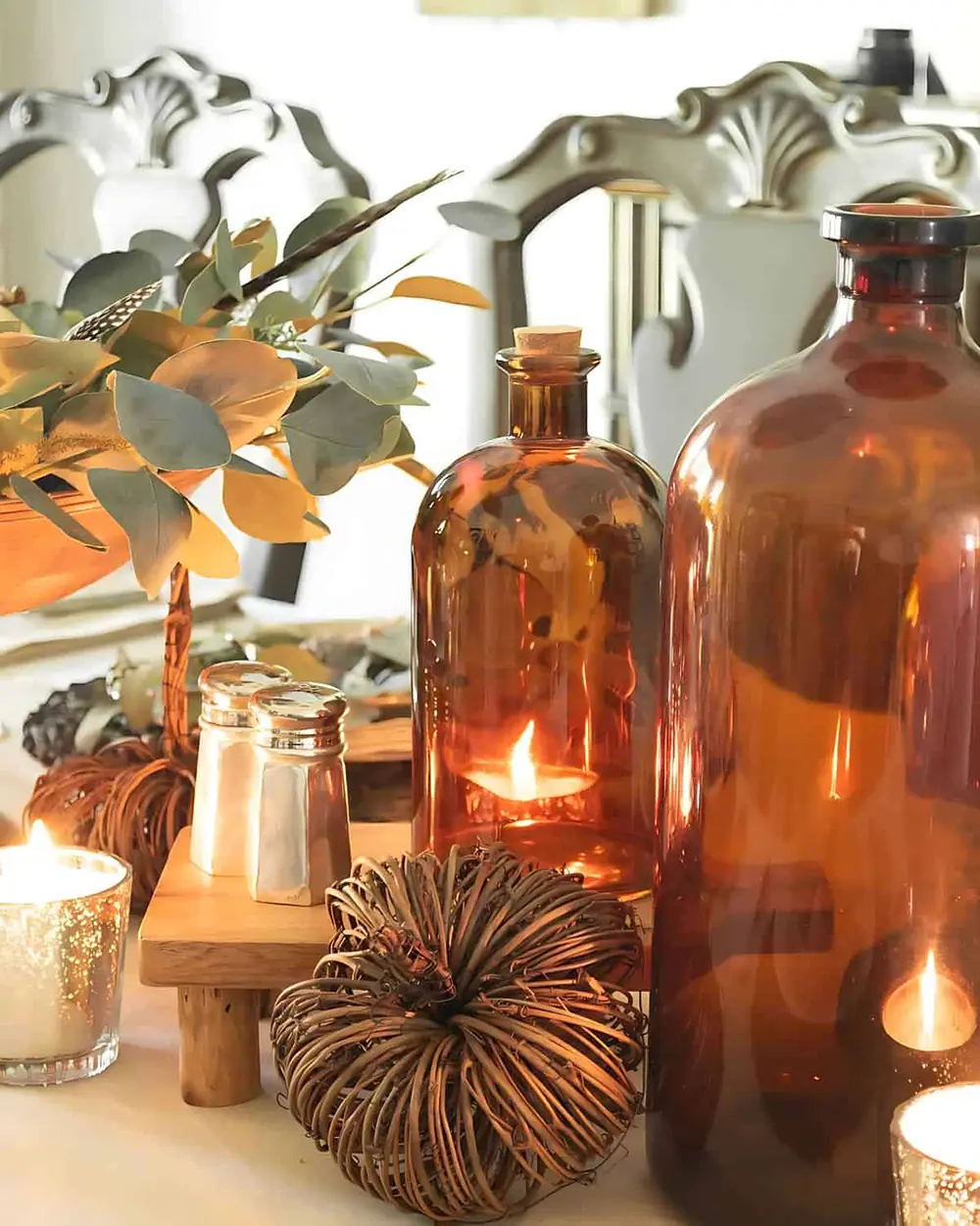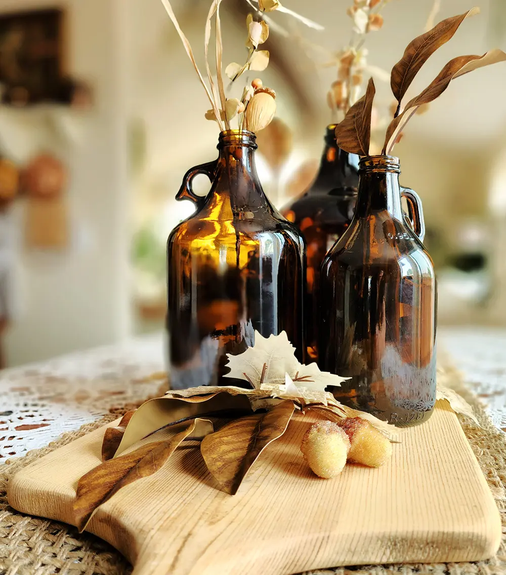 - Amber glass bottles: Style them with golden grasses, eucalyptus, or wheat for a rustic centerpiece.