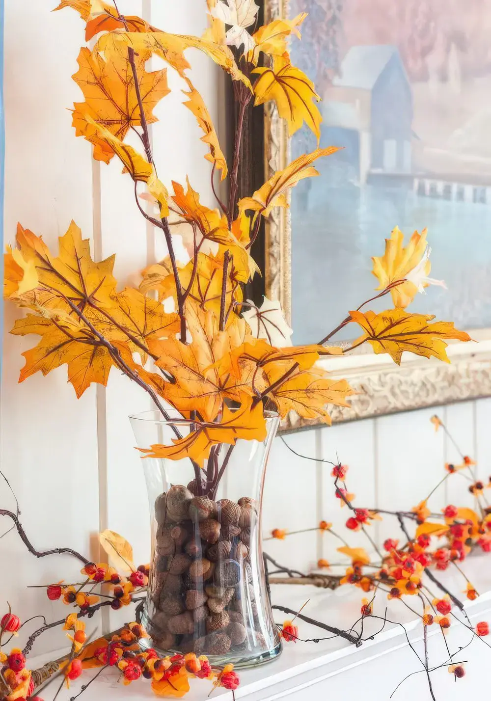 - Mantel accents: Fill a tall vase with acorns and branches of yellow leaves for a bold fall statement.
