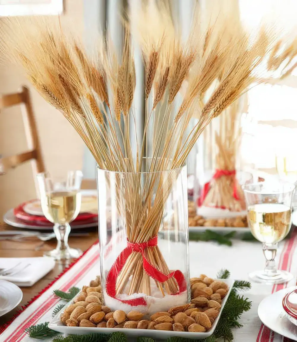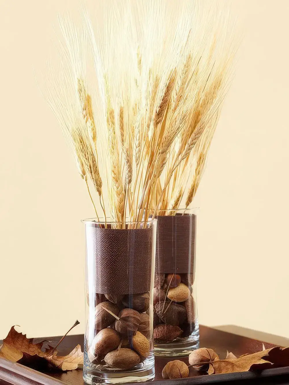 - Rustic centerpieces: Combine wheat stalks tied with a ribbon and a glass jar of nuts for a cozy fall-to-winter transition.