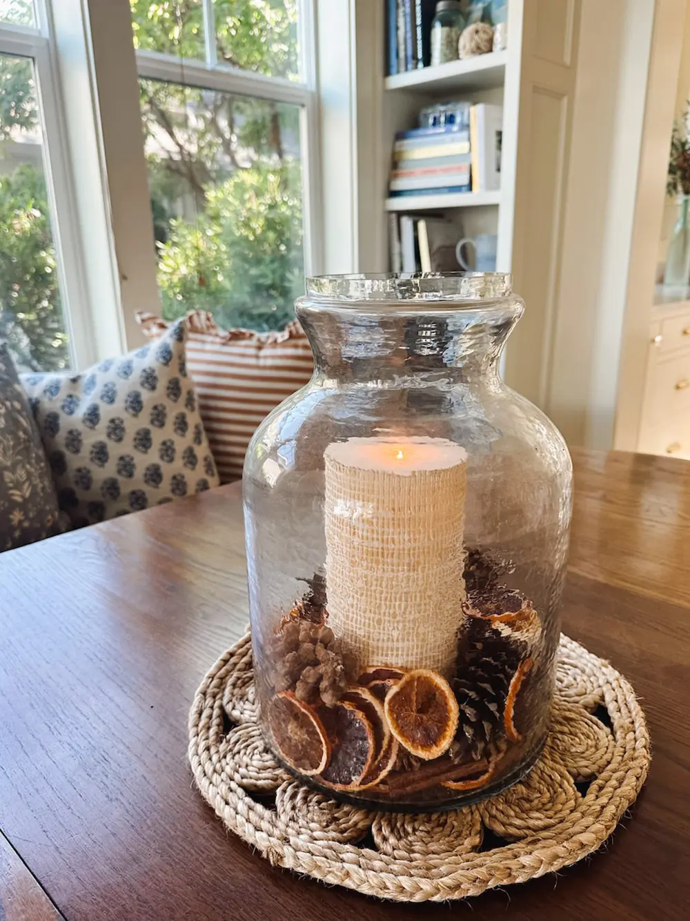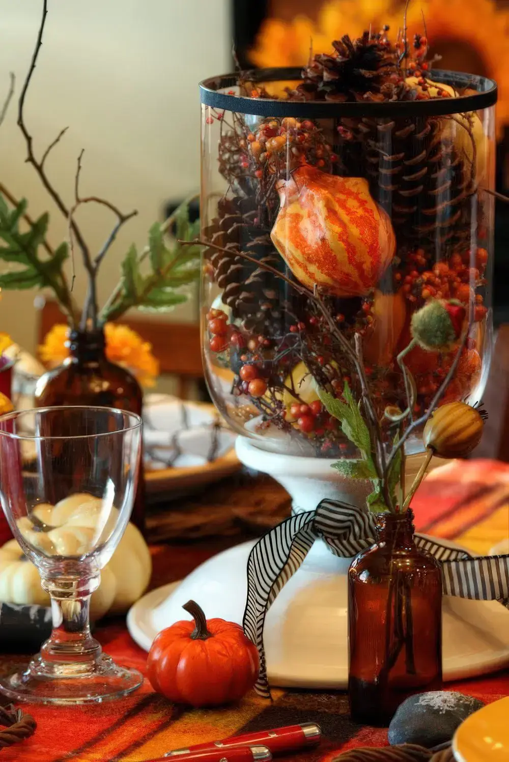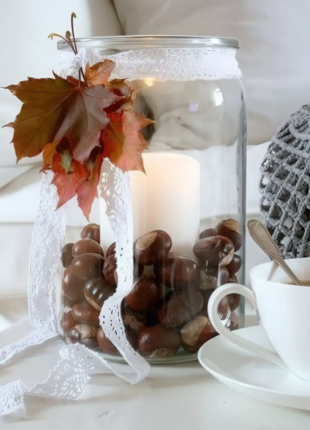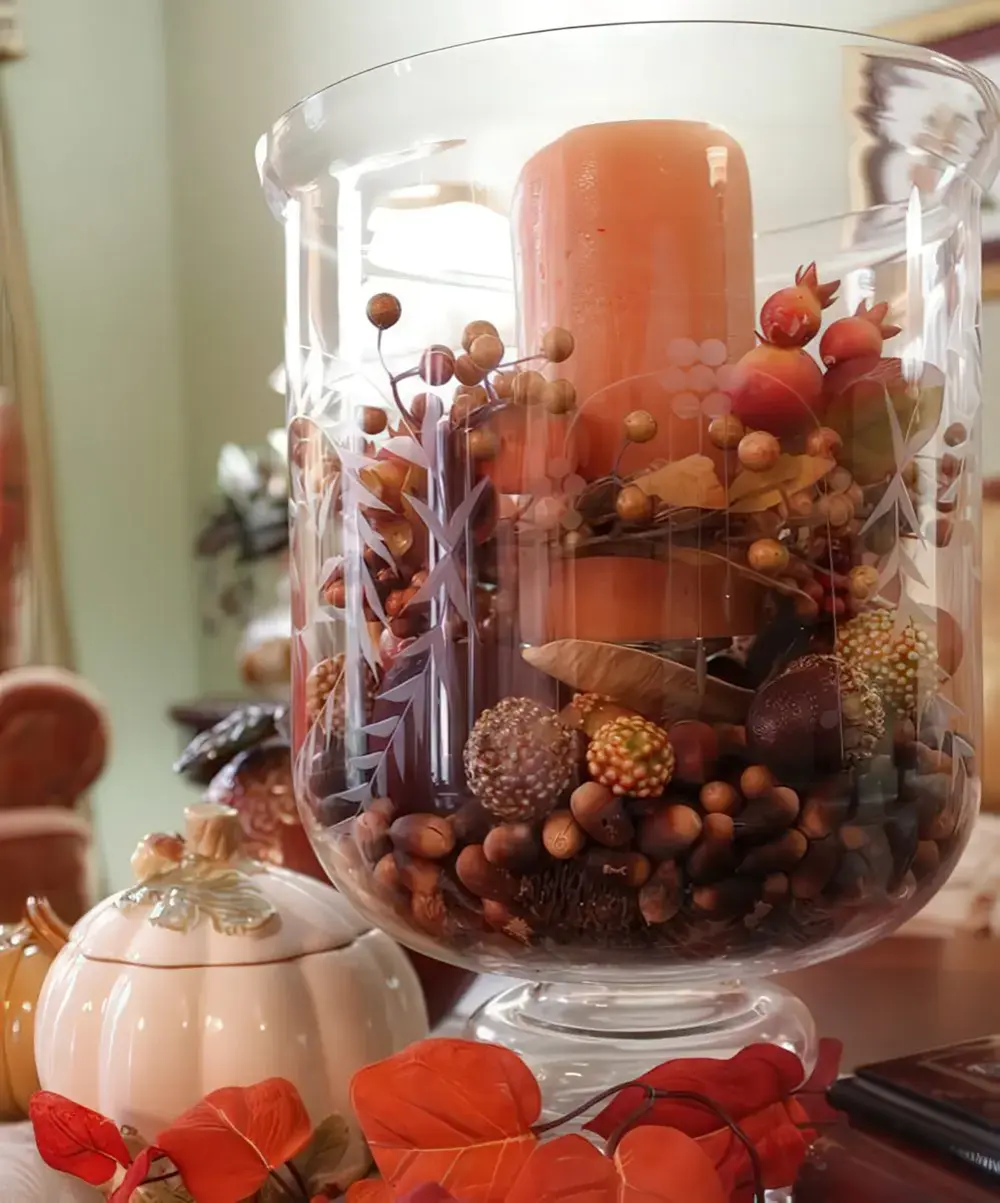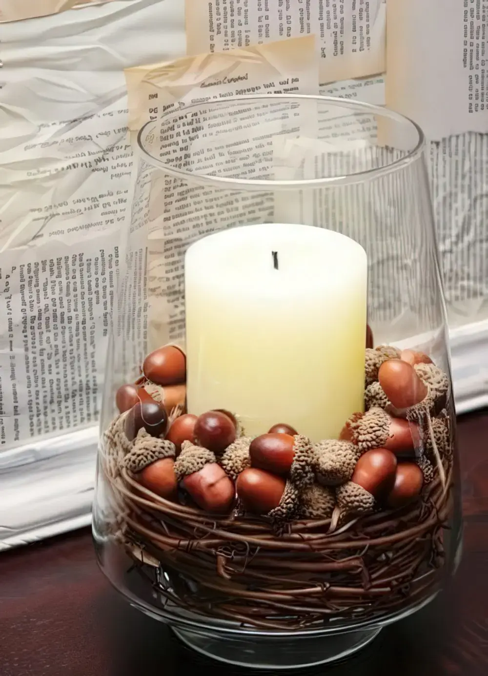 - Natural blends: Pair acorns, vines, and nuts with a candle inside a hurricane glass for rustic charm.