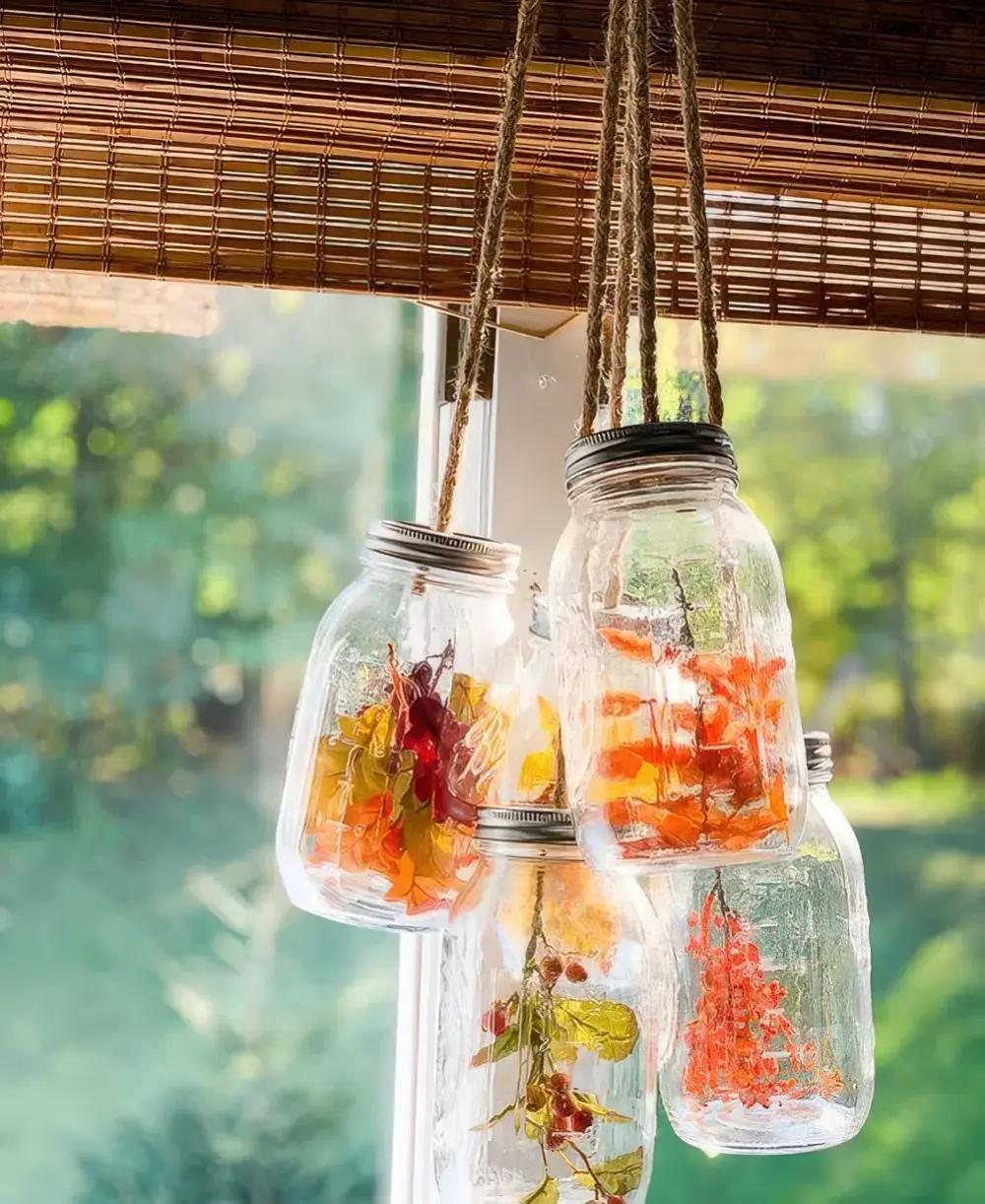 - Leaf-filled jars: Simply gathering colorful fall leaves in a clear jar makes for quick and free décor.