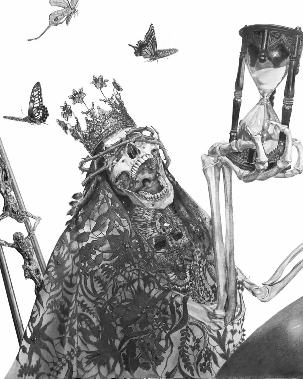 Lizz’s work is a masterclass in the macabre. Whether she’s sketching intricate, bone-chilling figures or hand-painting antique mirrors that look like they’ve been pulled from a haunted Victorian mansion, her aesthetic is unmistakably dark and deeply immersive. There is a raw, tactile energy in her art that feels both ancient and modern, blending medical precision with a love for the shadows.