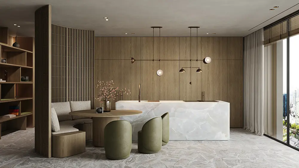 As you move through the house, the “Sienna” theme really comes alive. The kitchen and dining area are all about smart, space-saving tricks. There’s a massive marble island with a built-in faucet and a cozy breakfast nook tucked into a curved slat-wood wall. It’s the perfect spot for a family to gather on a slow Sunday morning.