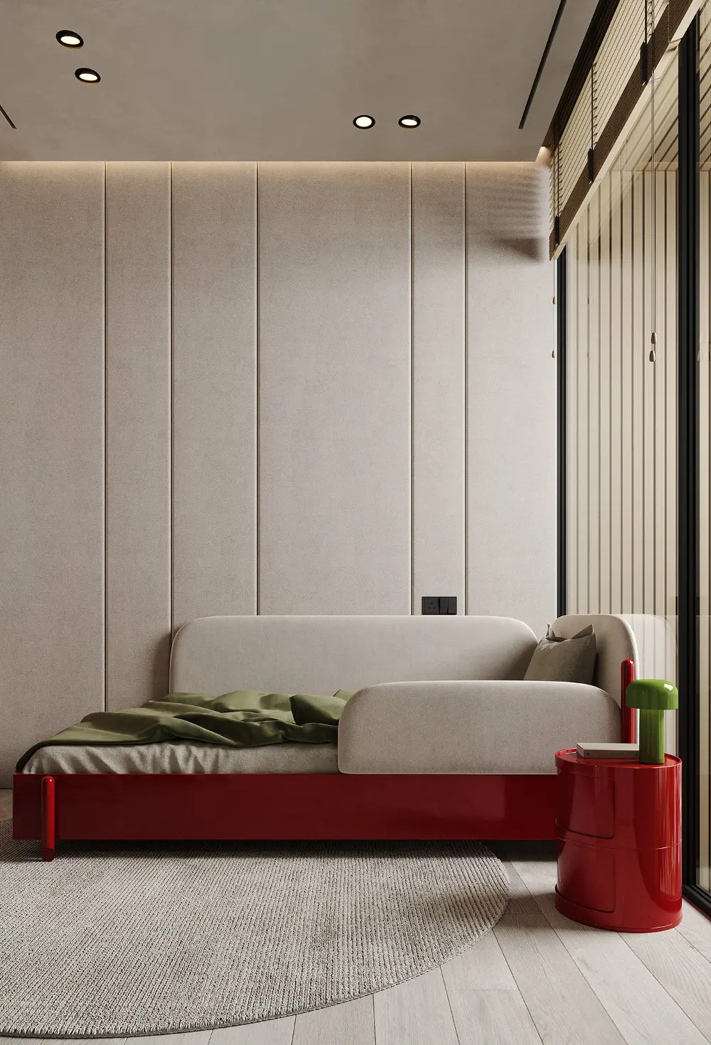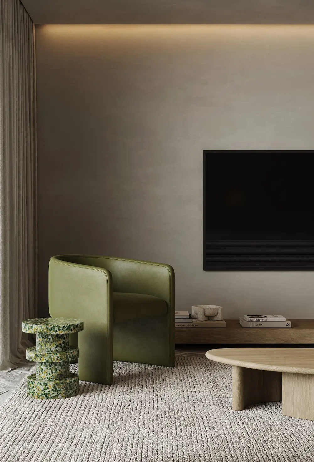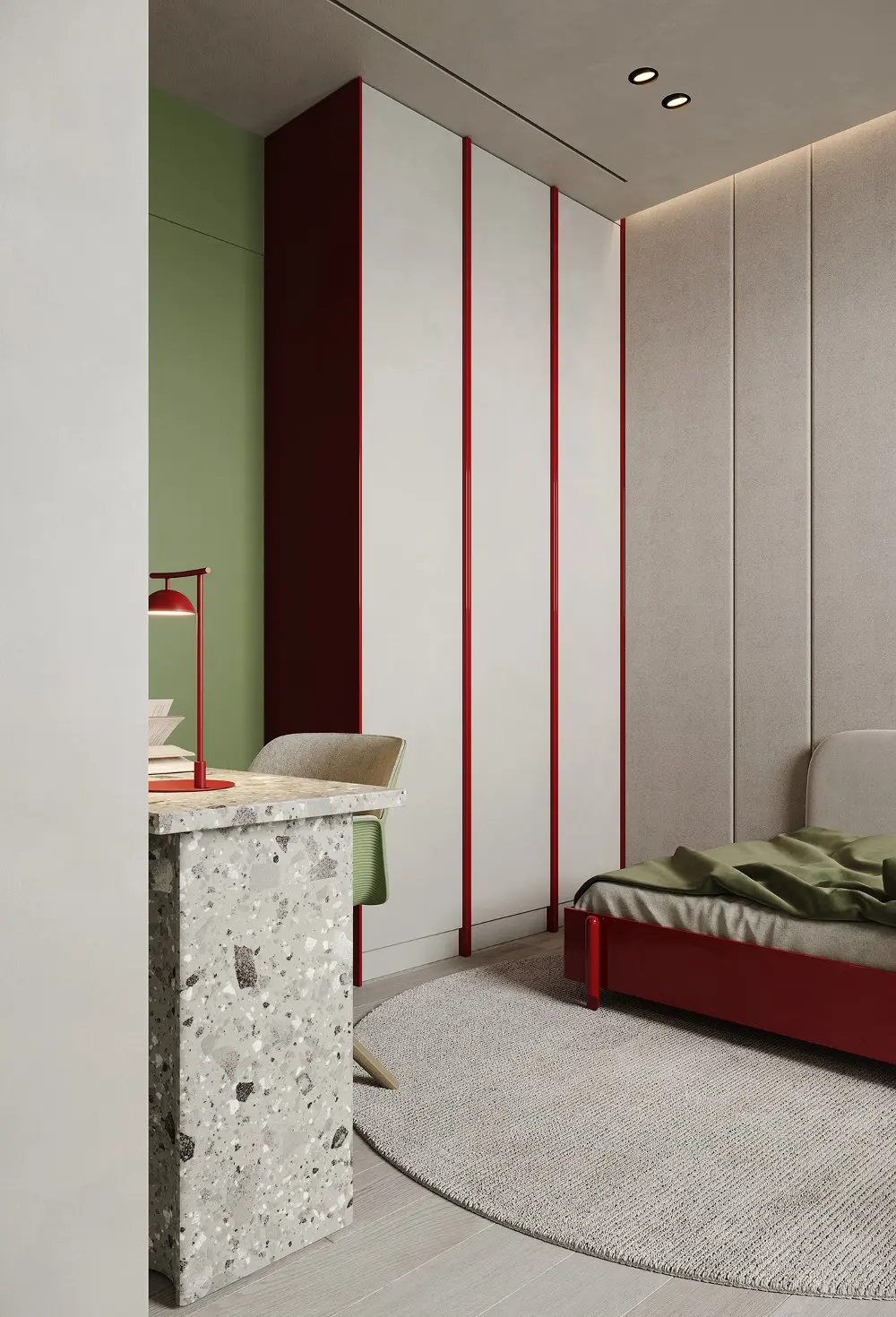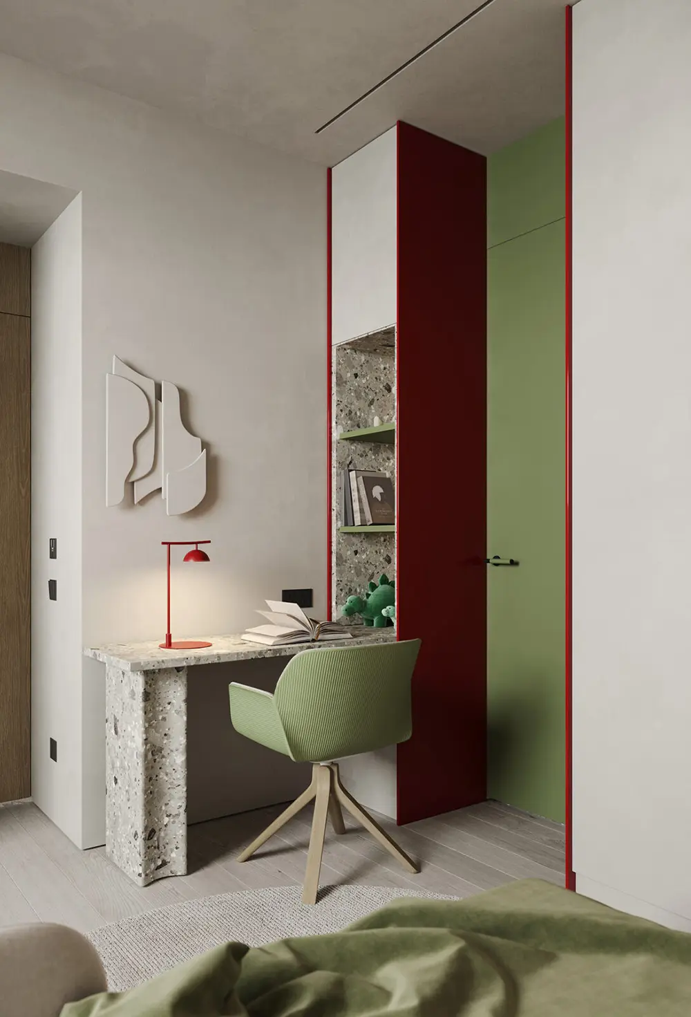 The bedrooms continue that flowing, organic feel with curved nightstands and lush olive green leather. But the kids’ room is the real showstopper! It’s actually where the “Sienna” name comes from, featuring pops of deep brown-red against a neutral backdrop. It even has a terrazzo desk and a green flowerpot lamp—it’s sophisticated enough for adults but playful enough for little ones. Every corner of this effortless sophistication project feels grounded, indulgent, and completely timeless.
