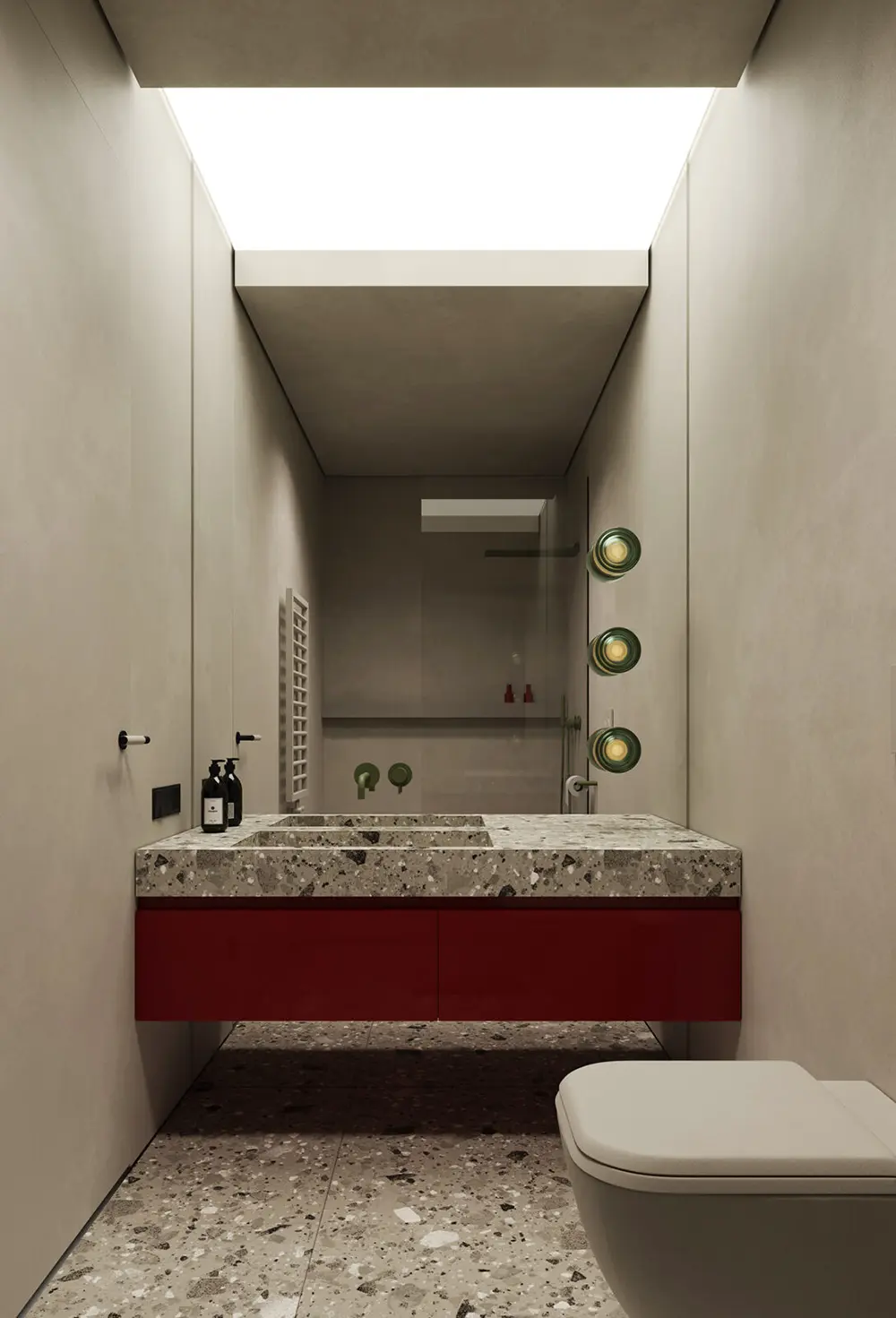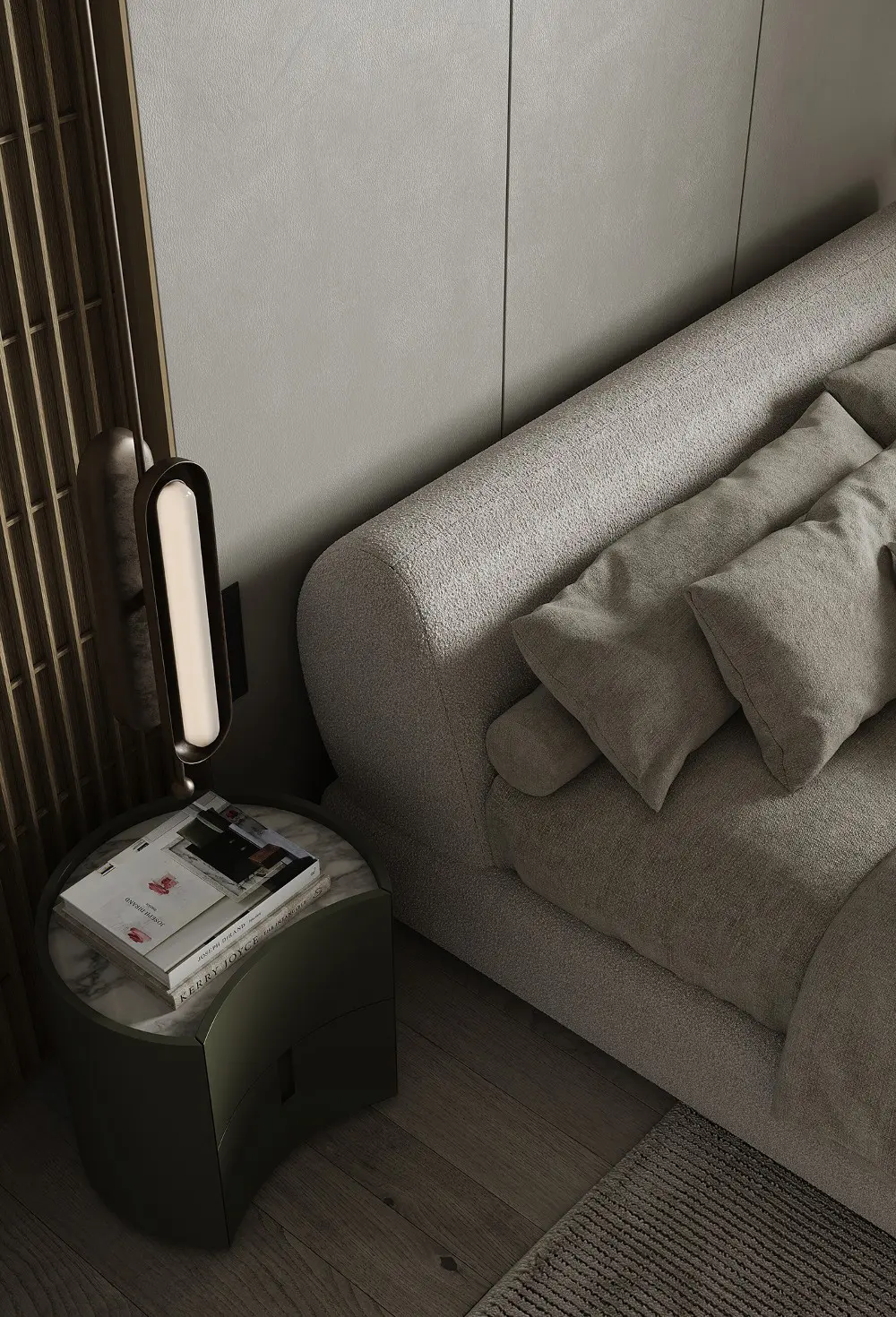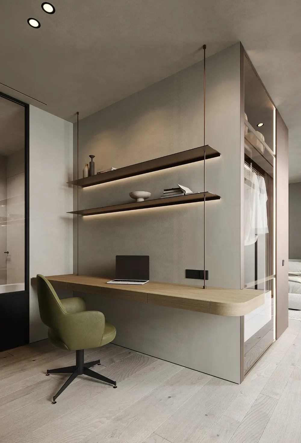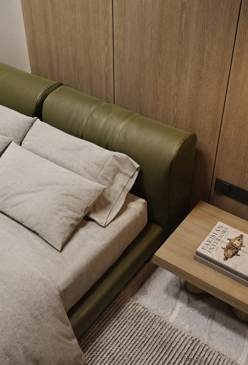 The bedrooms continue that flowing, organic feel with curved nightstands and lush olive green leather. But the kids’ room is the real showstopper! It’s actually where the “Sienna” name comes from, featuring pops of deep brown-red against a neutral backdrop. It even has a terrazzo desk and a green flowerpot lamp—it’s sophisticated enough for adults but playful enough for little ones. Every corner of this effortless sophistication project feels grounded, indulgent, and completely timeless.