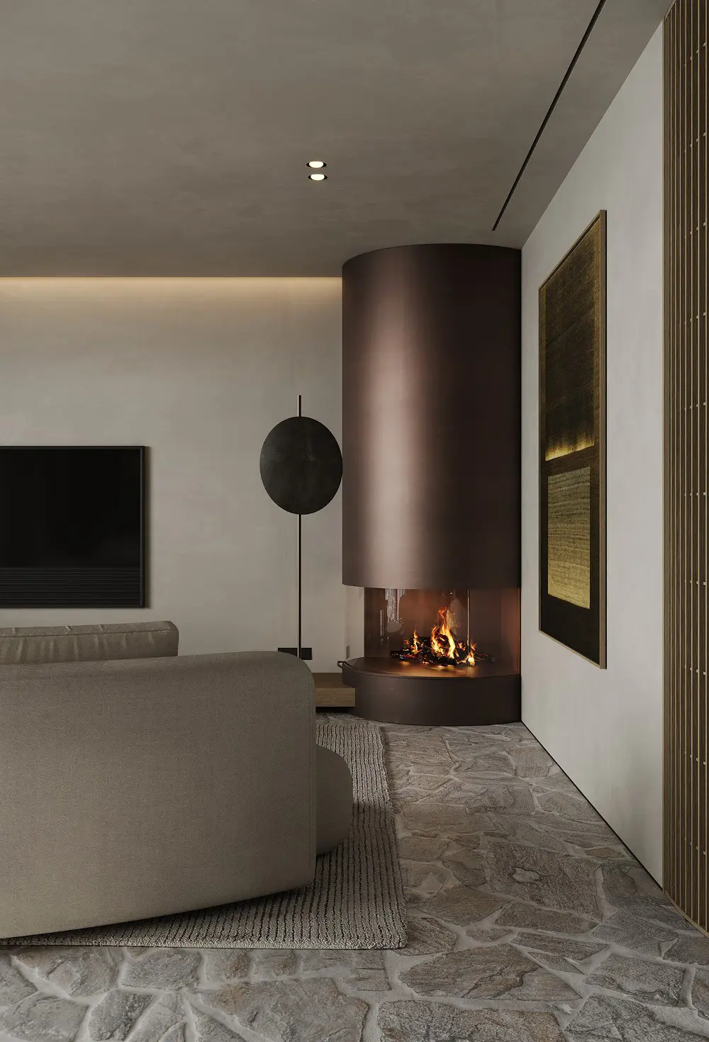 The living room sets the tone with a vibe I like to call “natural minimalism.” Think soft beige walls and a massive white sofa paired with a pop of olive green from a statement accent chair. Instead of a clunky traditional fireplace, there’s a sleek, cylindrical brown one that looks like a piece of art. My favorite part? The huge windows that turn the Toronto-like outdoor views into living decor.
