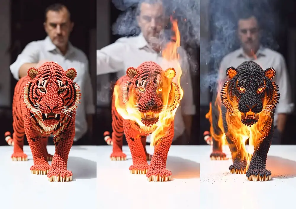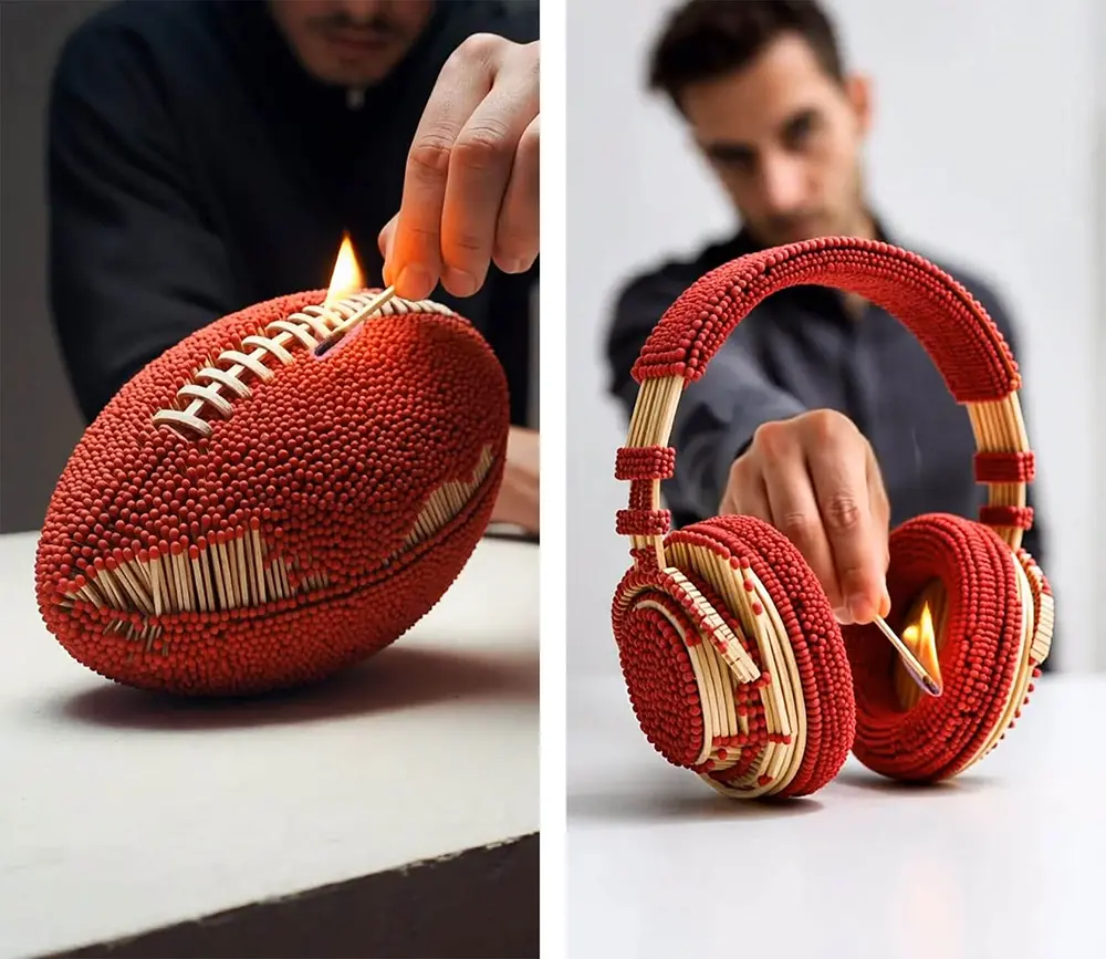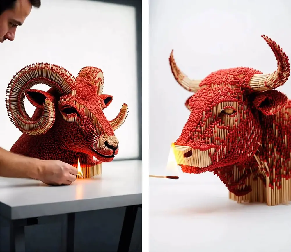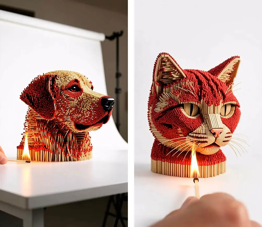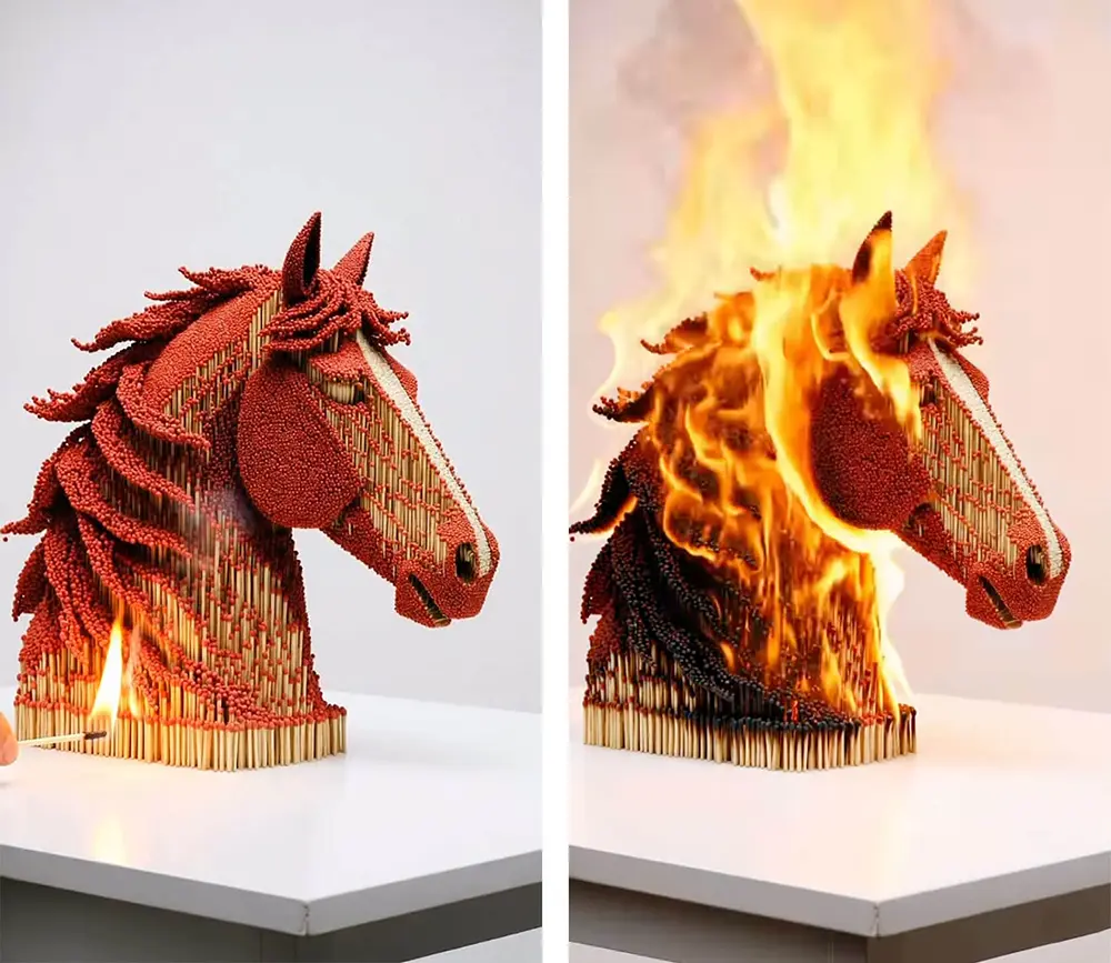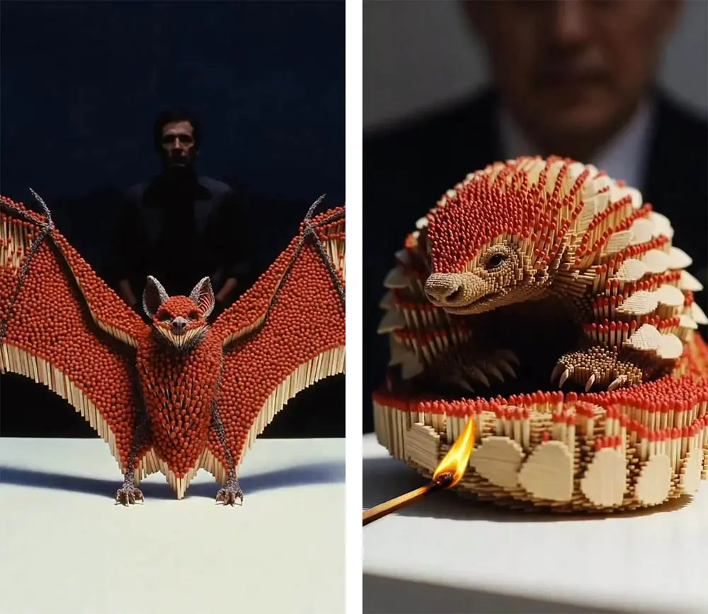 While these matchstick sculptures are undeniably cool and visually addictive, there’s a catch: they likely don’t exist in the physical world. If you look closely at the sequences, several tiny details suggest we are looking at high-end digital art rather than a wooden masterpiece. The way the fire moves and the perfect uniformity of the match heads are tell-tale signs of AI generation or digital rendering.