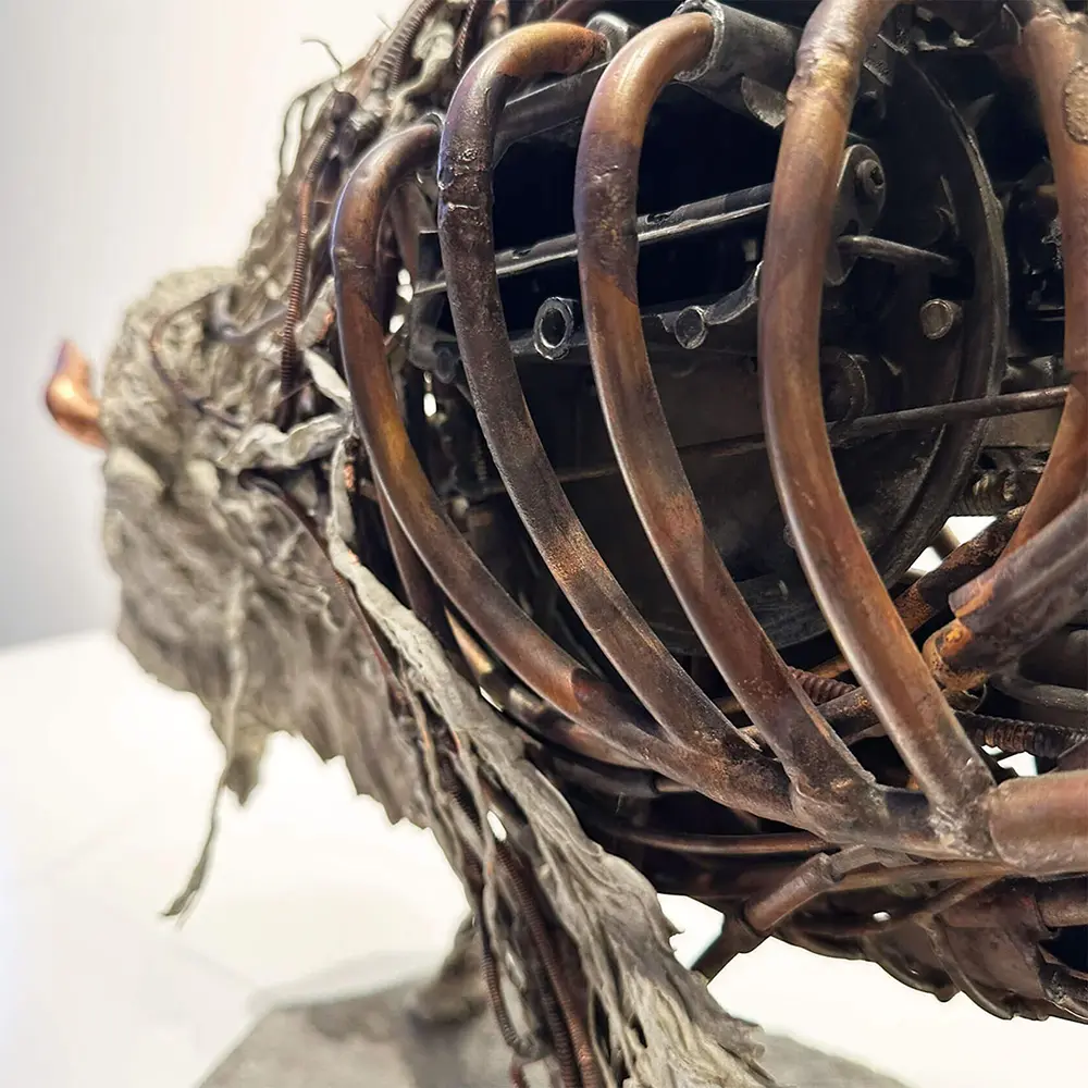 Chris spends hours searching through local scrap yards, handpicking discarded parts that most people would overlook. These weathered pieces—rusted gears, bent pipes, broken tools—often spark the beginning of a new creation. To balance the hardness of the metal, he adds sculpted clay elements that bring a softness and lifelike presence to his work.