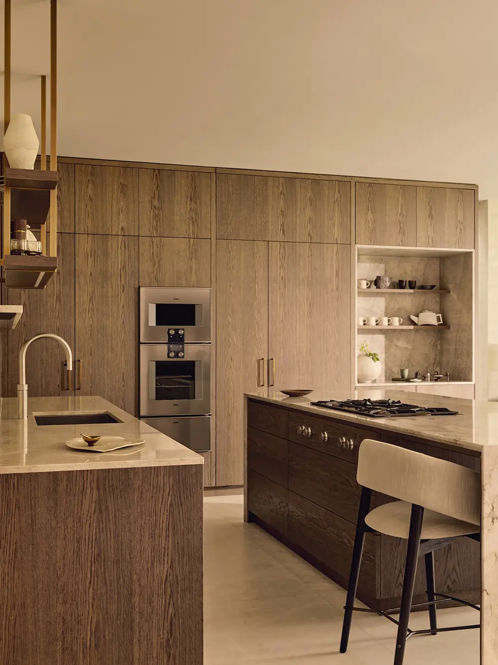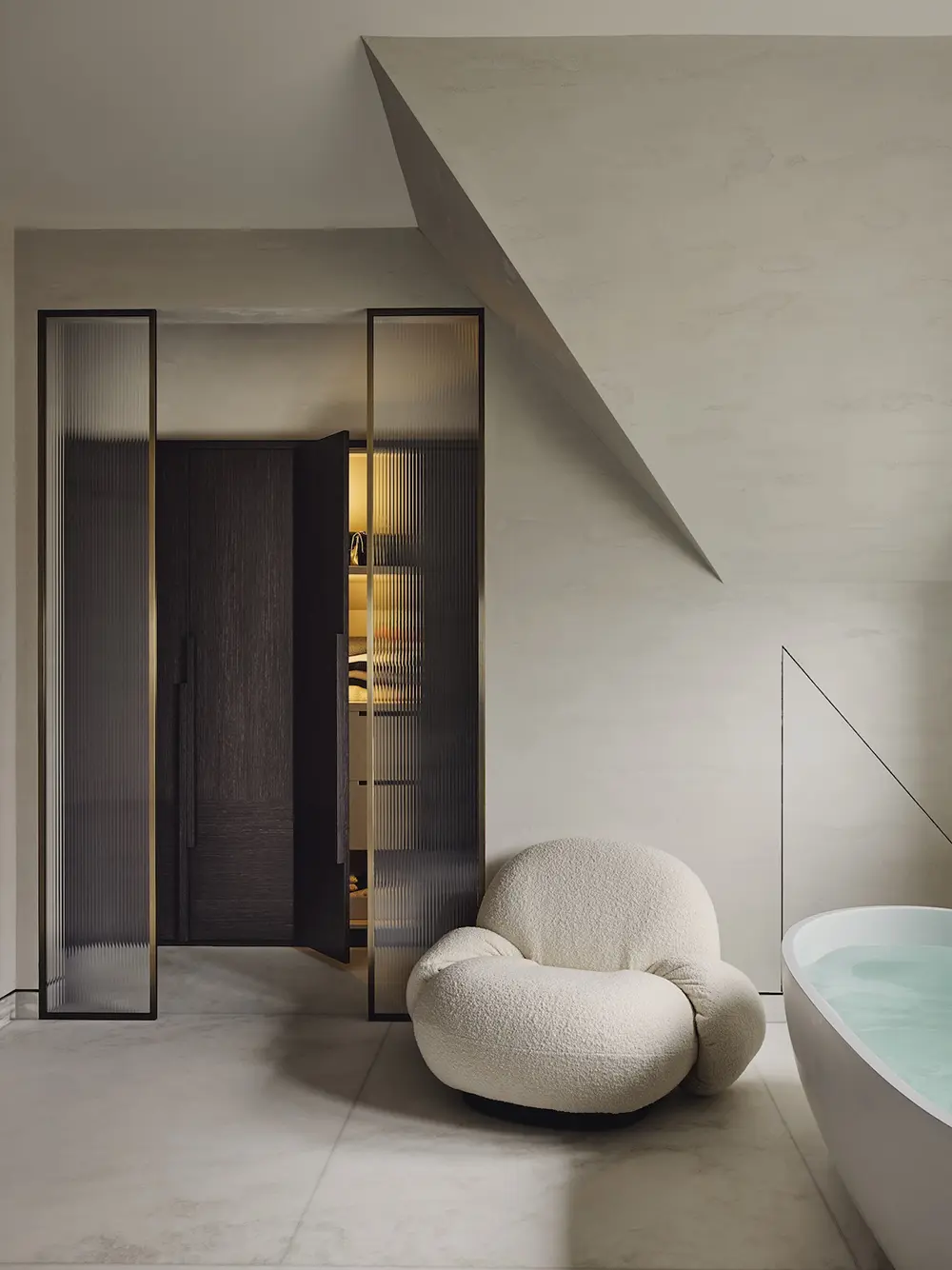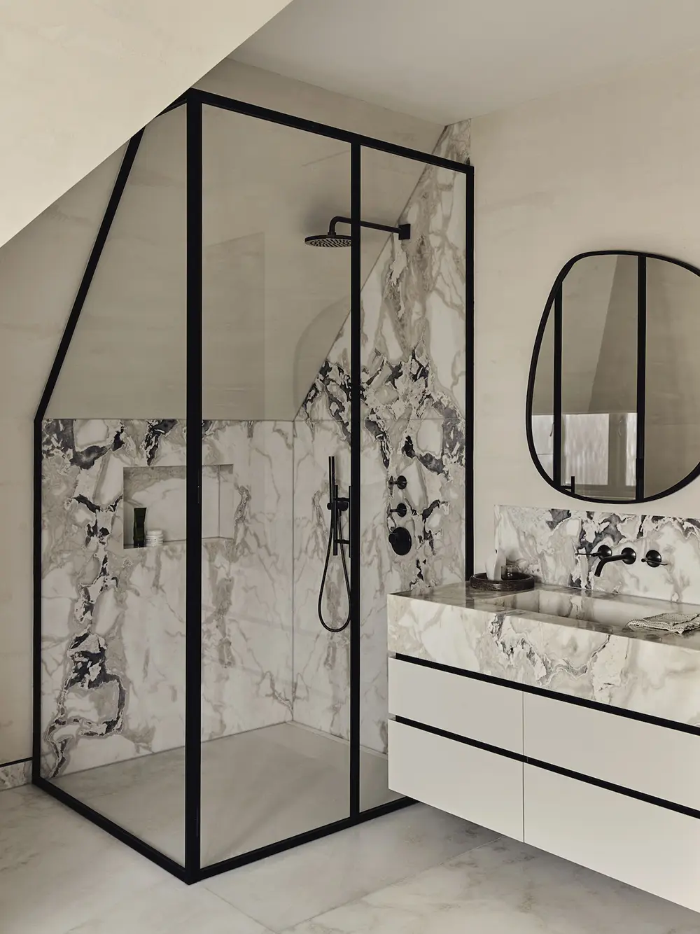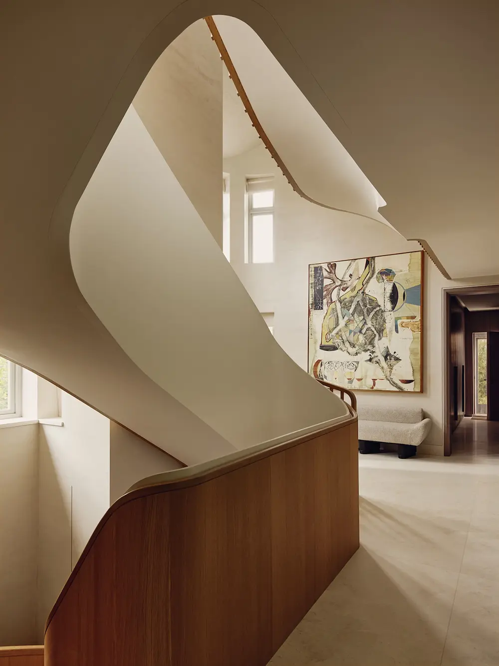 The interior follows a kind of luxurious minimalism. The entire ground floor is wrapped in White Emperador marble, more than fifty slabs of it, each polished in place so the seams practically vanish. The soft gray veining adds just enough movement, quietly supporting the homeowners’ art collection without stealing the spotlight. (Yes, I’m saying White Emperador marble can be humble.)