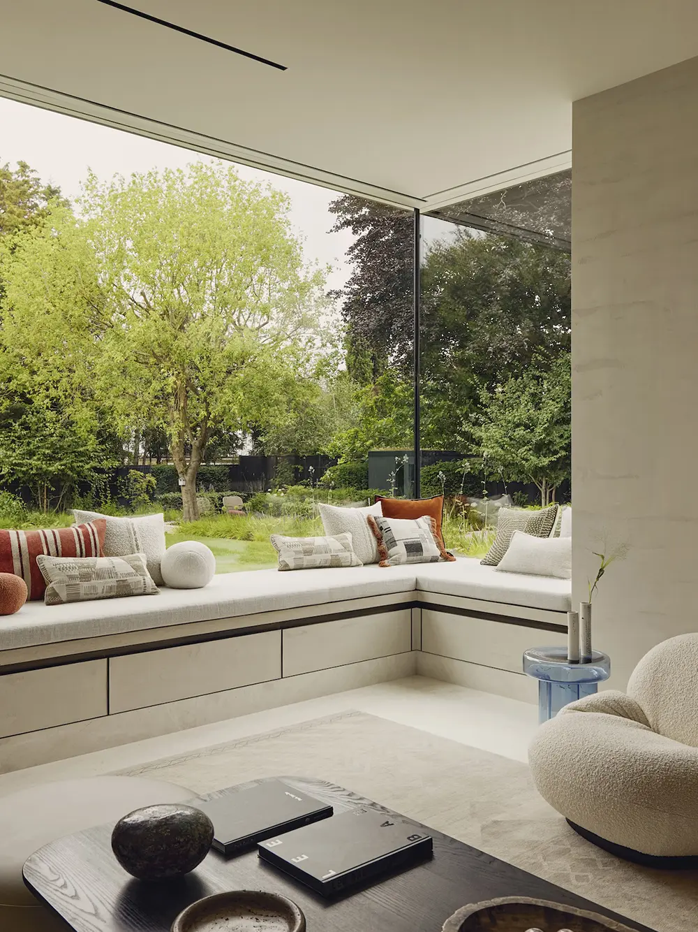 And the furniture? Custom pieces crafted with Indian artisans, warm oak stains, soft bronze accents, and earthy fabrics that play nicely with the artwork instead of competing with it. The showstopper is the three-story Charles Burnand glass installation, developed alongside the homeowner, who happens to be a glass artist—meaning this South West London renovation wasn’t just a project; it was a true creative partnership.
