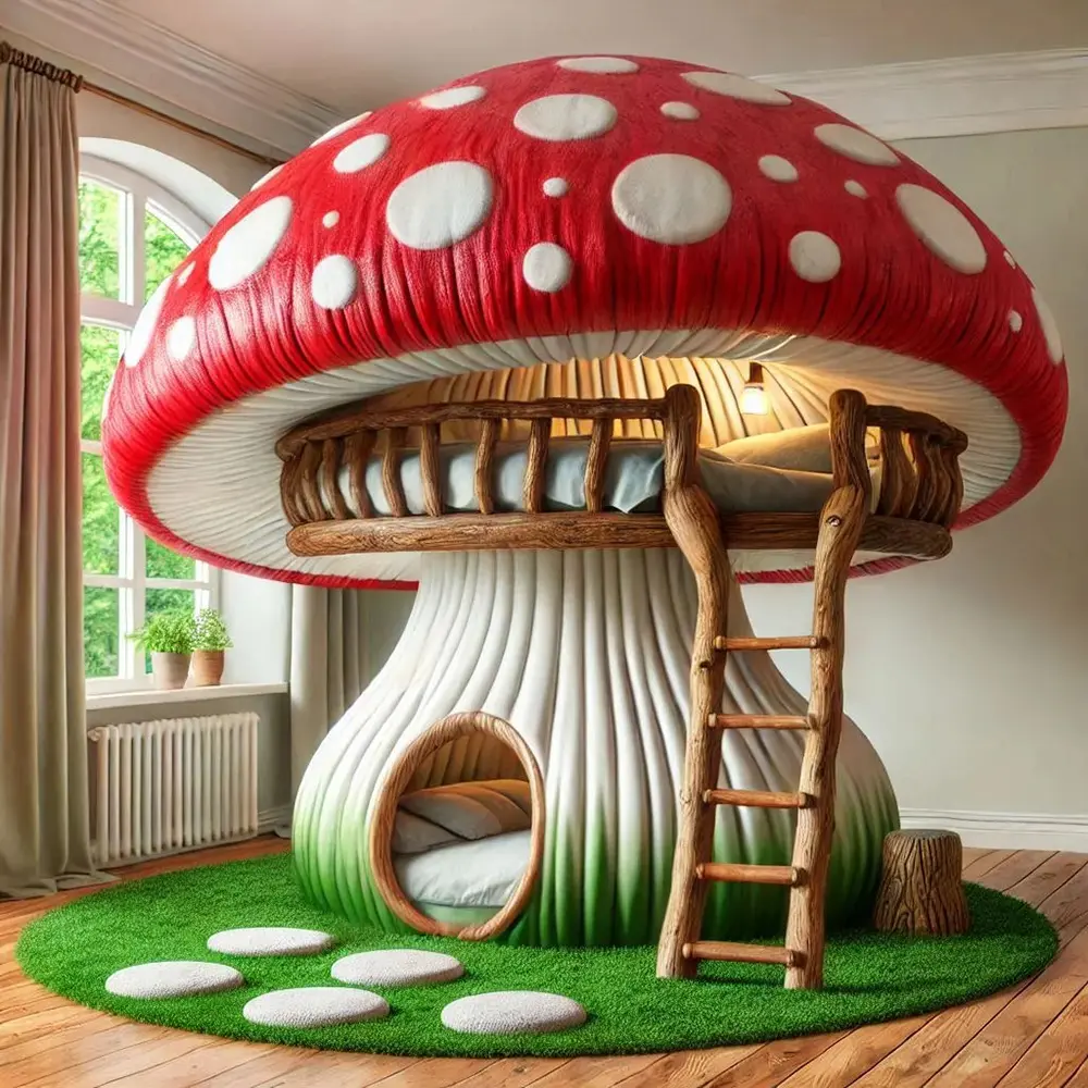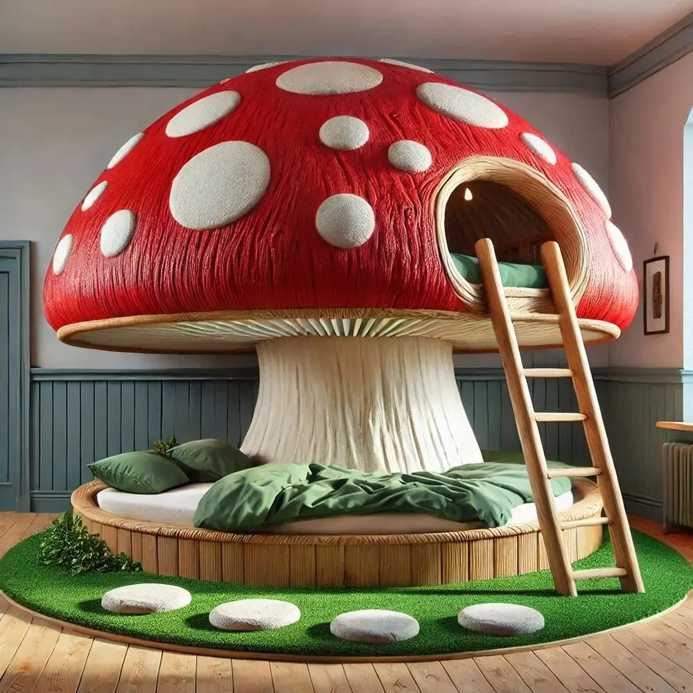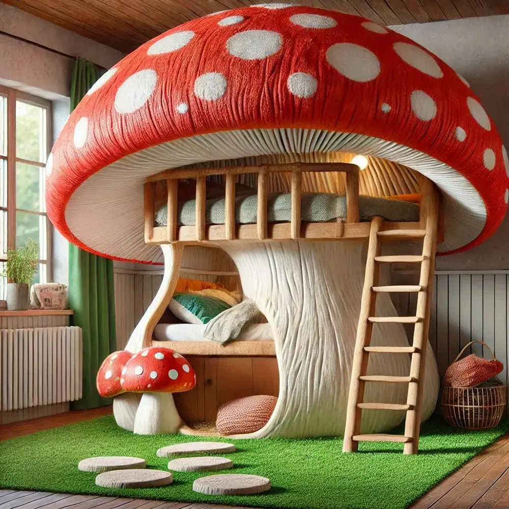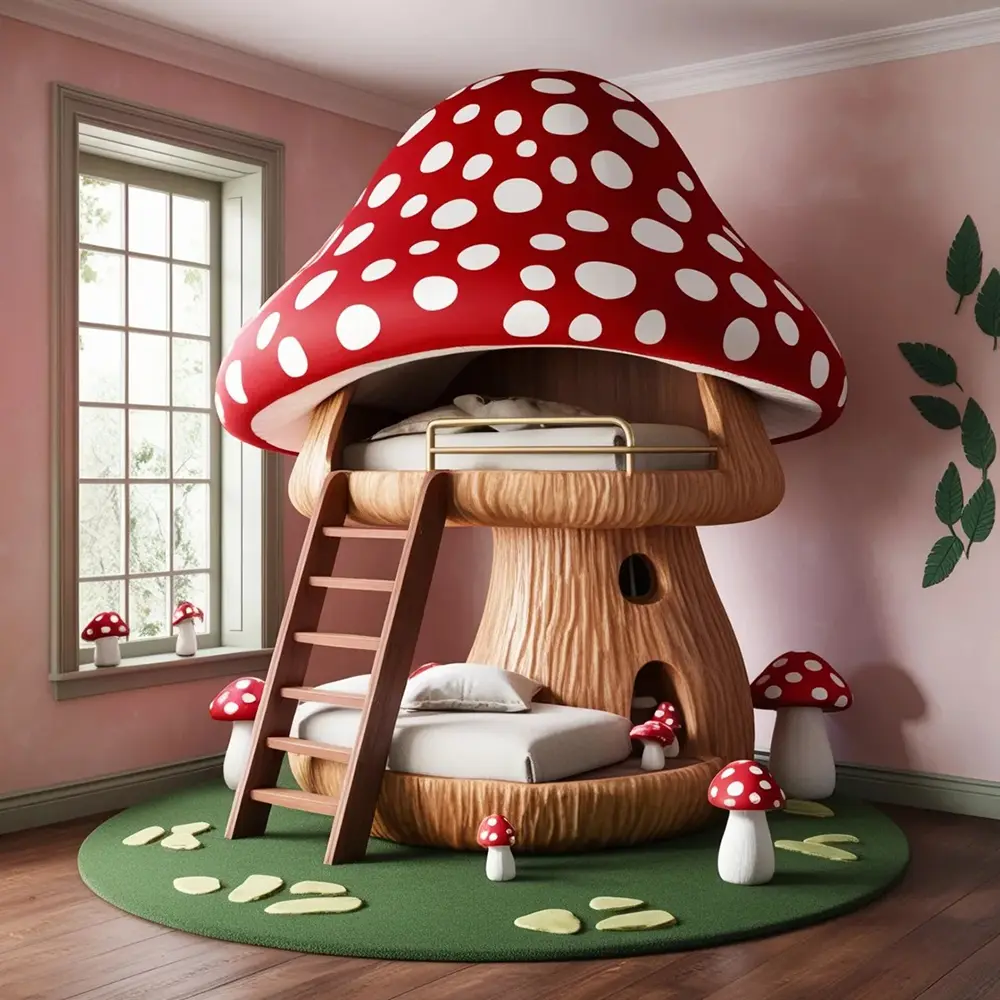 Beyond just a place to sleep, these beds act as indoor playgrounds. Many versions include built-in wooden ladders, soft “moss” carpeting, and stepping-stone cushions that complete the forest floor aesthetic. Imagine the stories your children will tell as they climb into their very own fungal fortress! Whether you prefer the sleek, polished look of a modern nursery or the rustic, textured feel of a woodland cabin, the Mushroom Bunk Bed is a centerpiece that sparks the imagination and turns every bedtime into a magical adventure.