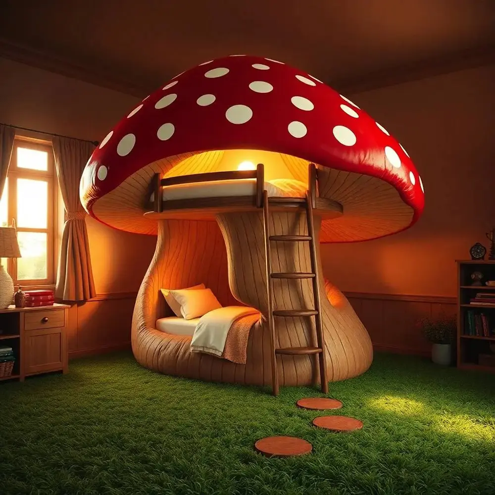 As seen in these stunning AI-generated concepts, the design features a vibrant, red-and-white spotted cap that serves as a cozy canopy for the top sleeper. The attention to detail is breathtaking; the stems are textured like real organic bark or soft gill-like ridges, creating a sturdy base that houses a secondary “nook” bed at the bottom.