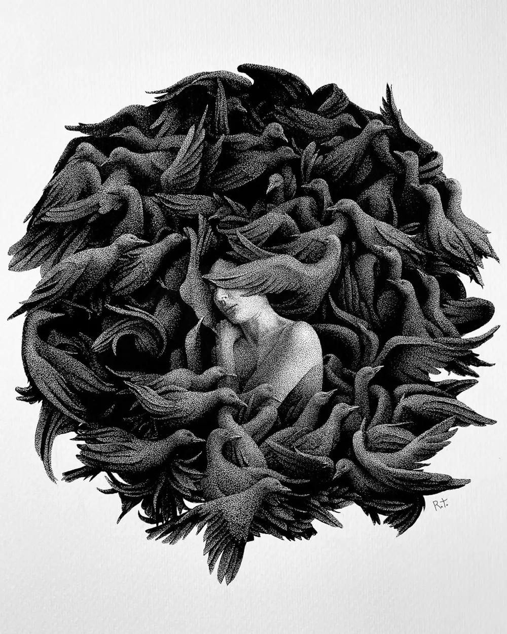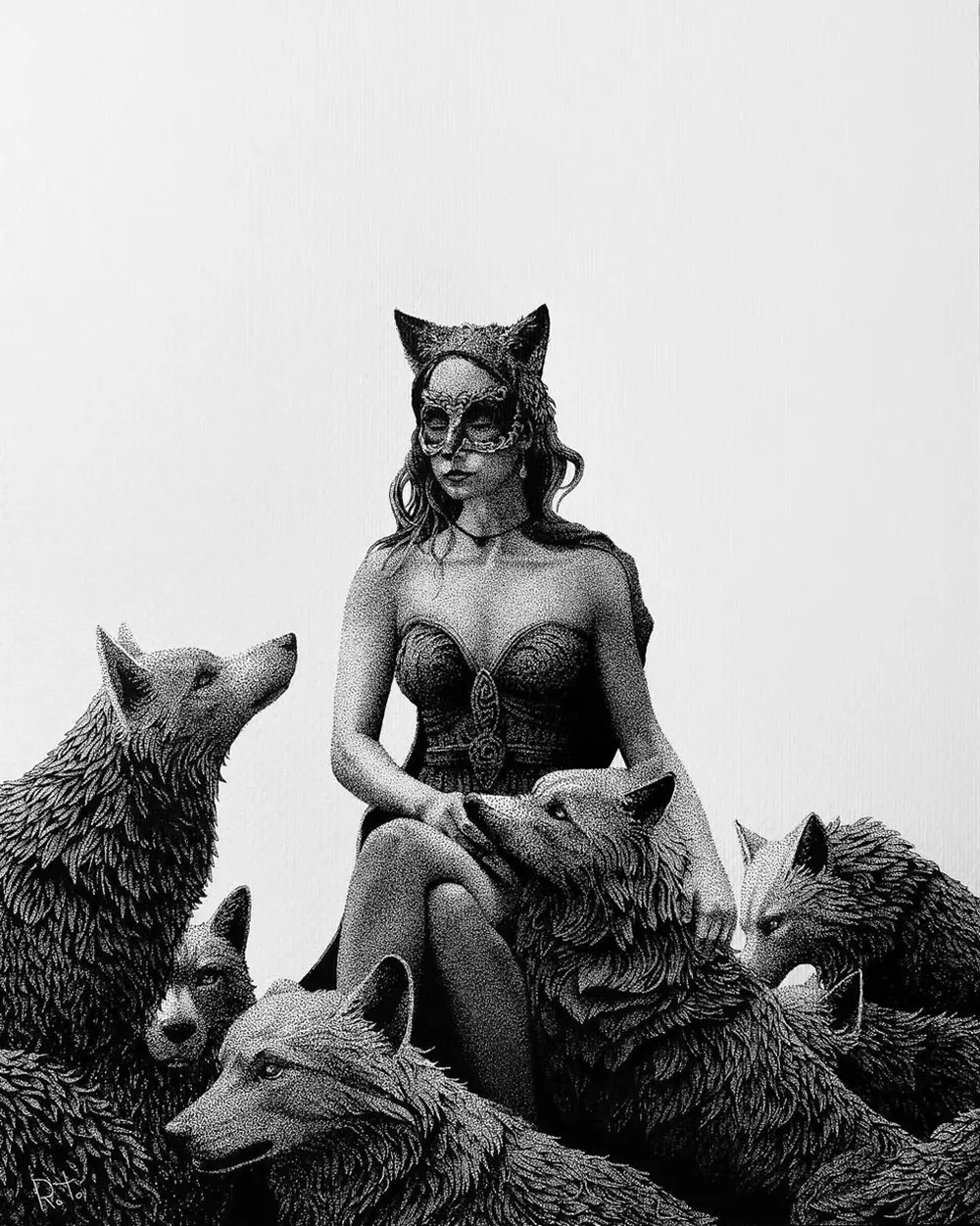 If you’re into black and white dotwork art that feels quiet, intense, and a little haunting, you’ll probably find yourself stuck staring at the work of Rostislaw Tsarenko. He’s a Ukrainian ink artist from Poltava who taught himself how to turn tiny dots into entire emotional worlds—and honestly, it’s hard to look away.