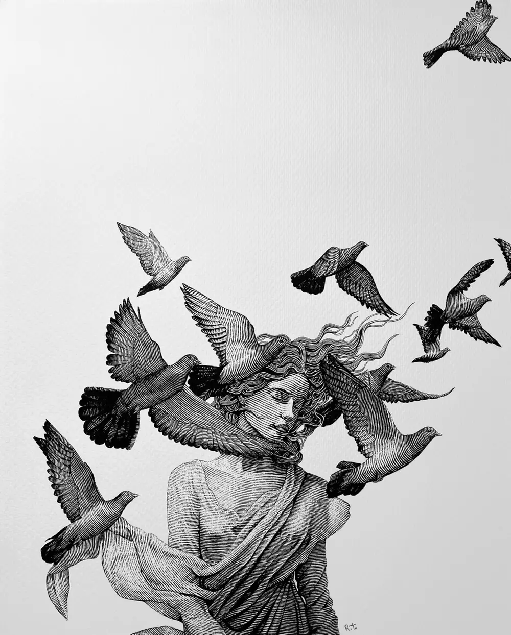 Alongside personal series such as Human and Nature, this Ukrainian ink artist has also shown his work in international group exhibitions, including Silver Linings, where his drawing Light of Truth was featured. Today, Rostislaw Tsarenko sells original works and prints through platforms like Artmajeur and Myartisreal, while sharing process videos and archived pieces on Instagram.