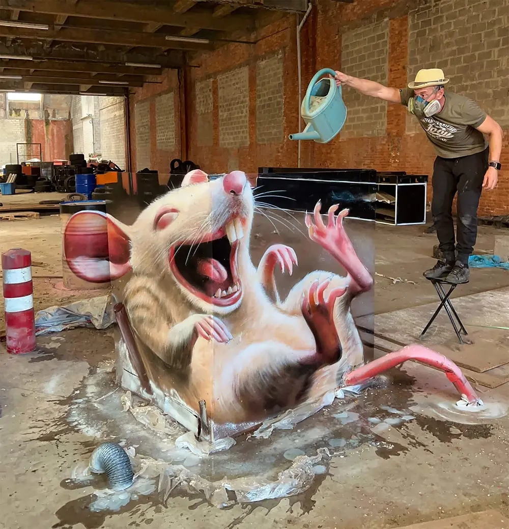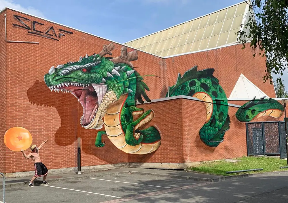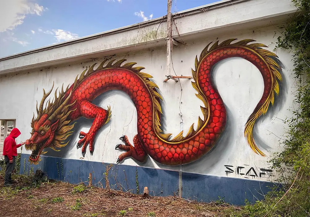 Scaf’s work is built on anamorphic illusions—murals that look flat until you find the perfect angle, where suddenly a dragon is bursting through bricks or a giant snake is slithering across ruins. In one mural, a playful mouse lounges on a block of stone as if it’s part of your space. With each piece, he masterfully uses perspective, props, and even the surrounding architecture to heighten the illusion.