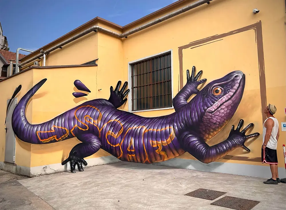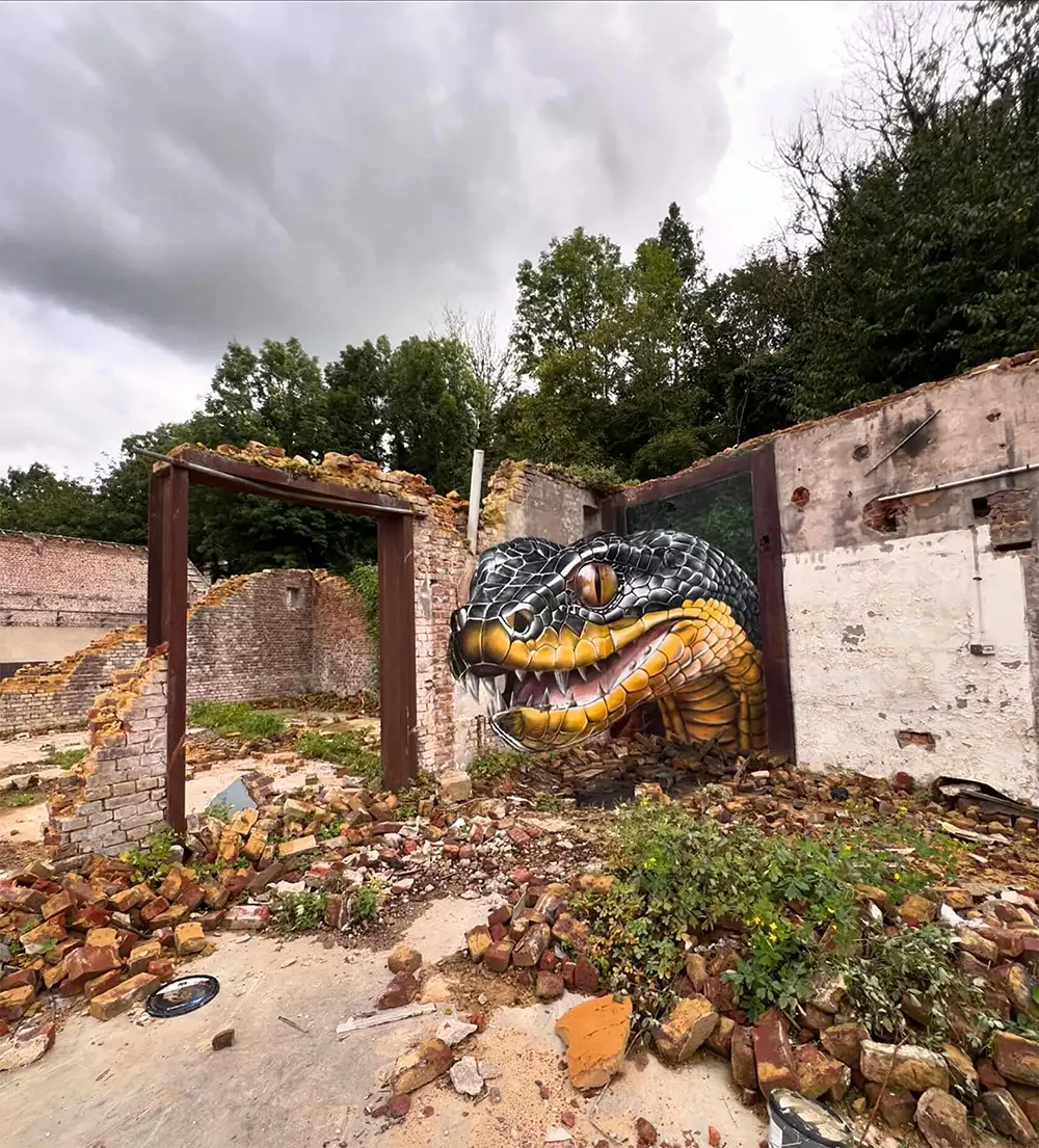 What makes his Scaf 3D murals stand out, beyond their technical brilliance, is his sense of humor. No matter how fierce or massive the creatures he paints, there’s always a lighthearted twist. It could be a cheeky pose, a funny detail, or simply the unexpected joy of finding such art in an abandoned spot. That balance of awe and playfulness makes his murals approachable while still jaw-dropping.