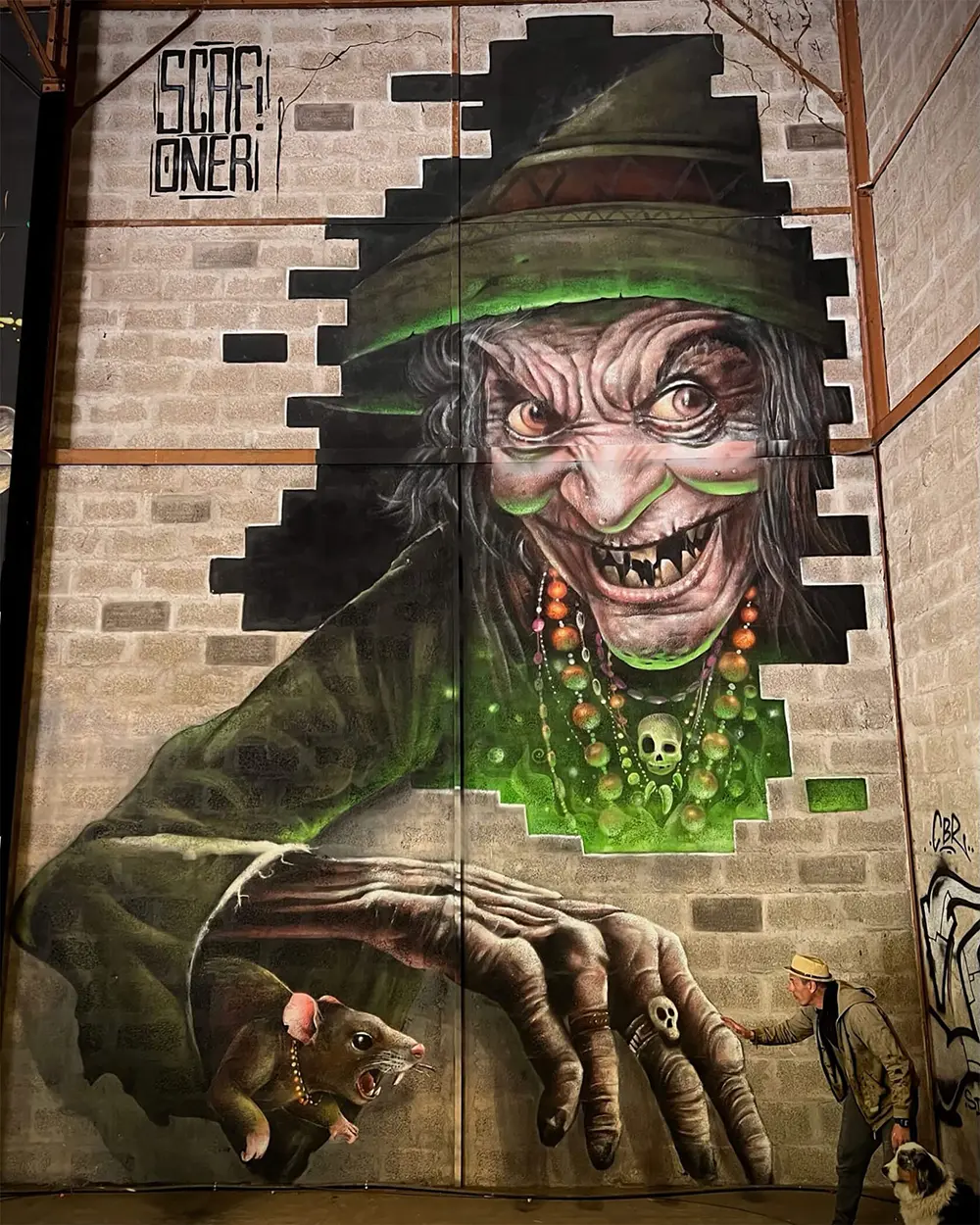 Unlike traditional graffiti, Scaf’s anamorphic murals feel interactive—inviting you to step closer, pose, and even become part of the scene. Each mural feels like a doorway into another world, where fantasy and reality collide in the most delightful way.