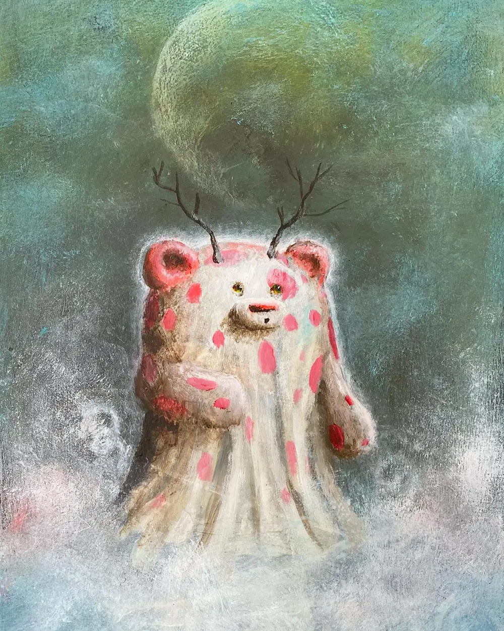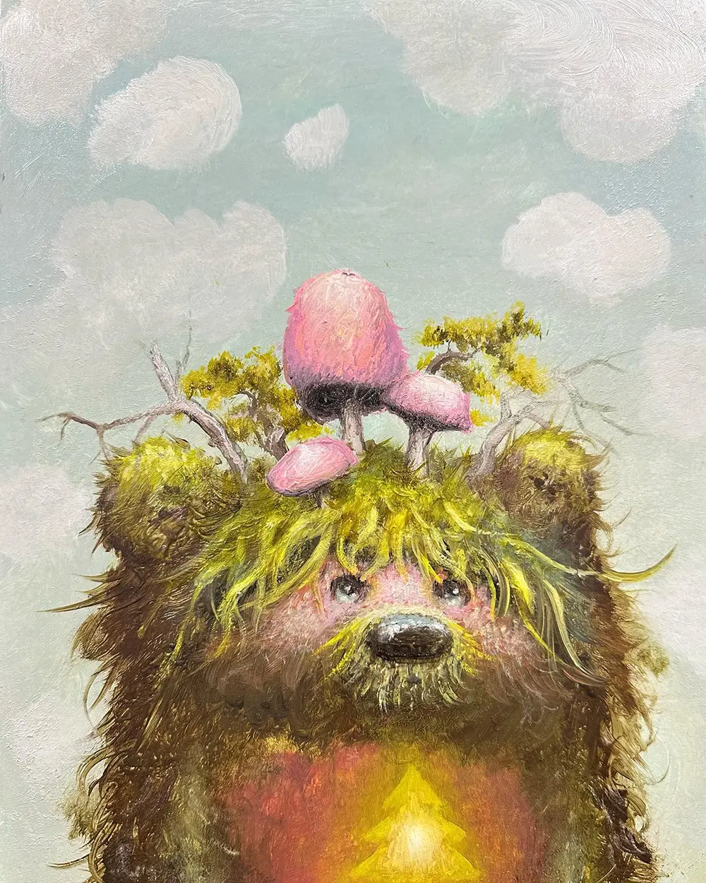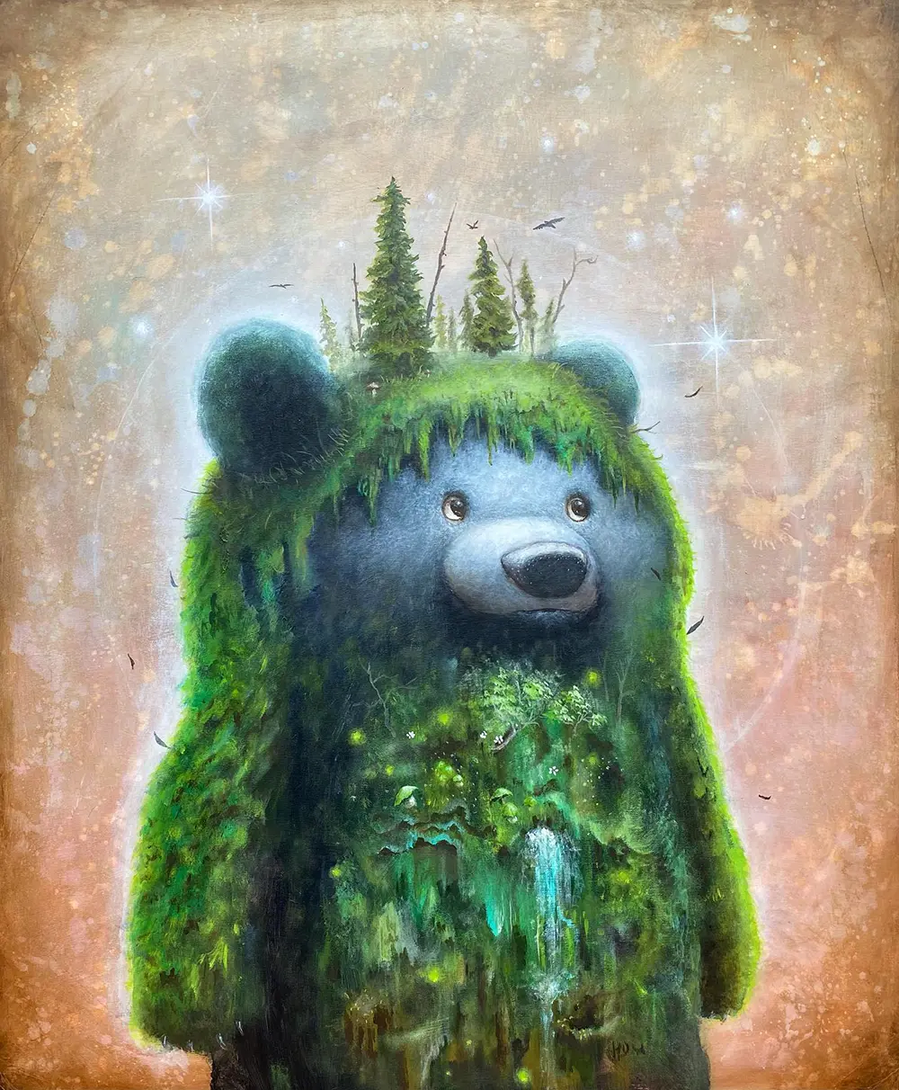 Working primarily in acrylic and oil, Scott builds these quietly strange scenes where nature and inner emotion beautifully overlap. Looking closely at his pieces, you’ll find symbolic characters—bears, birds, and insects—floating through glowing, otherworldly atmospheres. Everything feels like a moment captured from a vast, unseen mythology.