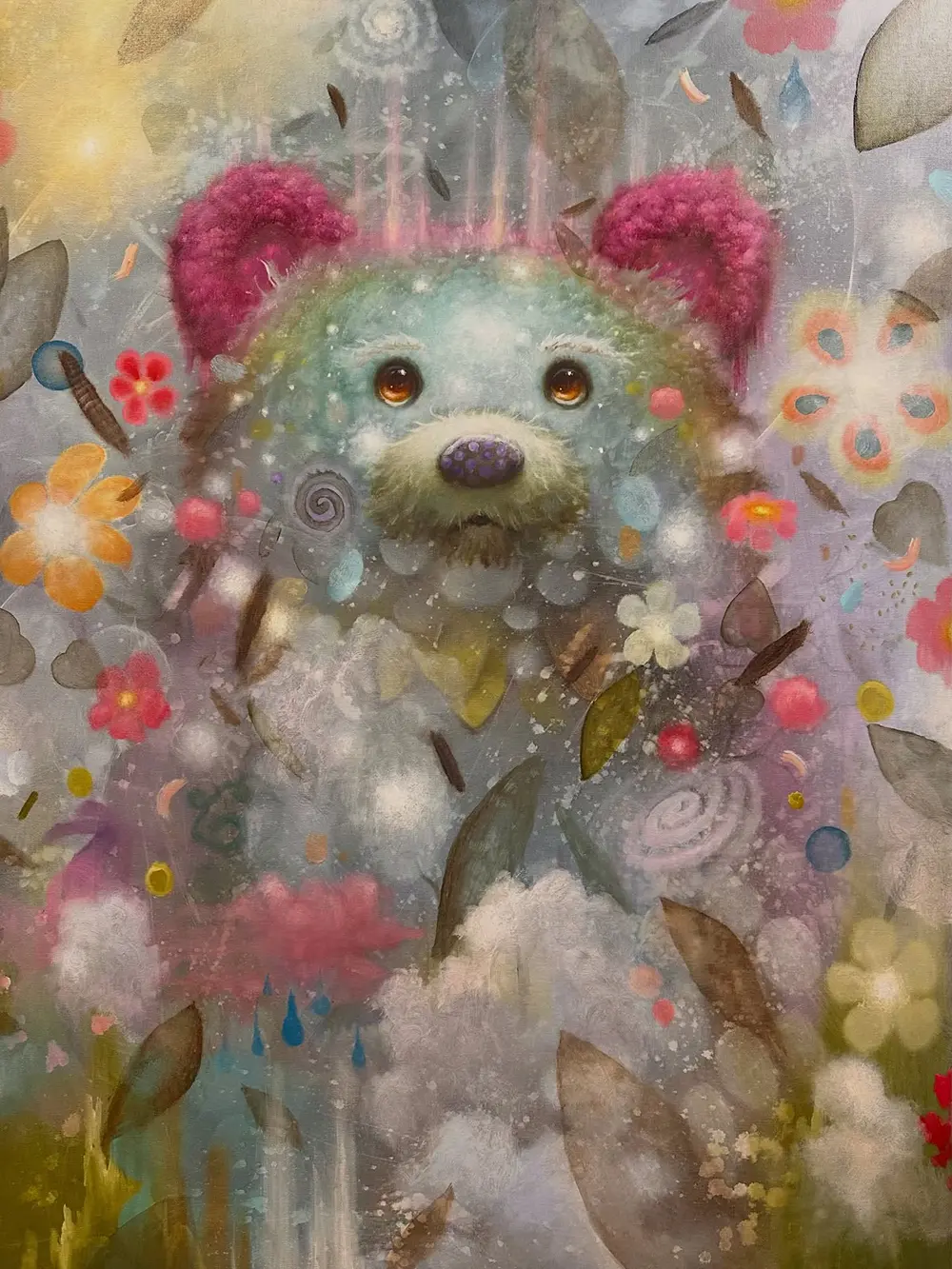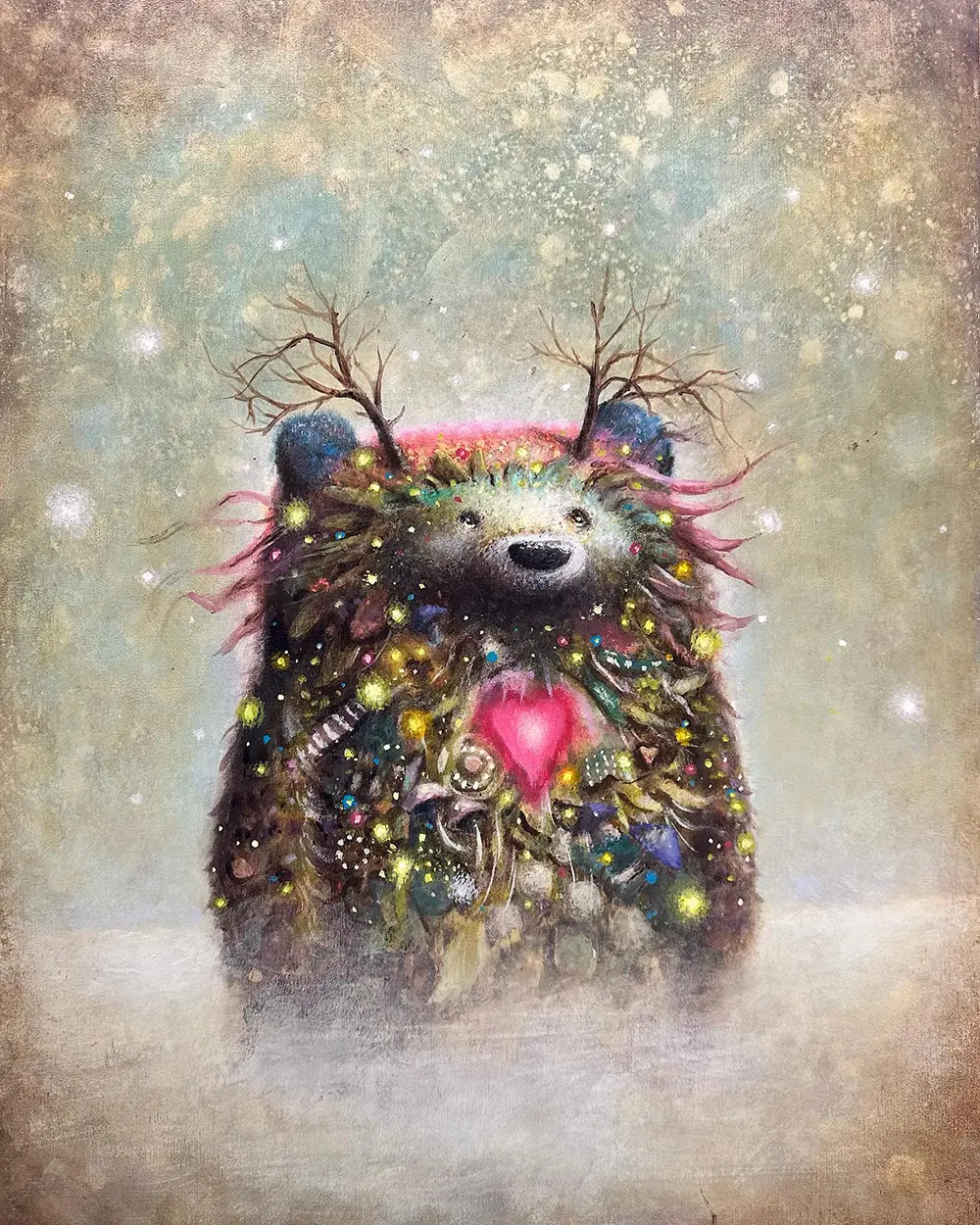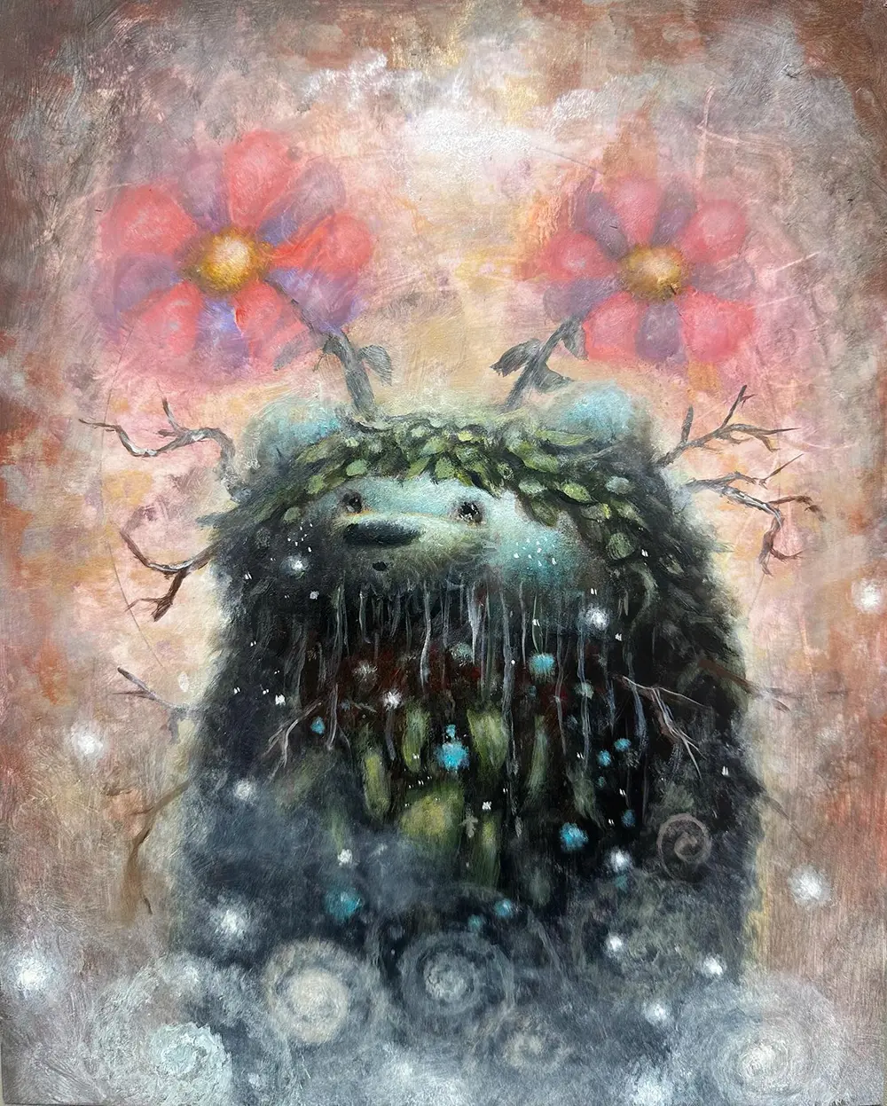 Working primarily in acrylic and oil, Scott builds these quietly strange scenes where nature and inner emotion beautifully overlap. Looking closely at his pieces, you’ll find symbolic characters—bears, birds, and insects—floating through glowing, otherworldly atmospheres. Everything feels like a moment captured from a vast, unseen mythology.