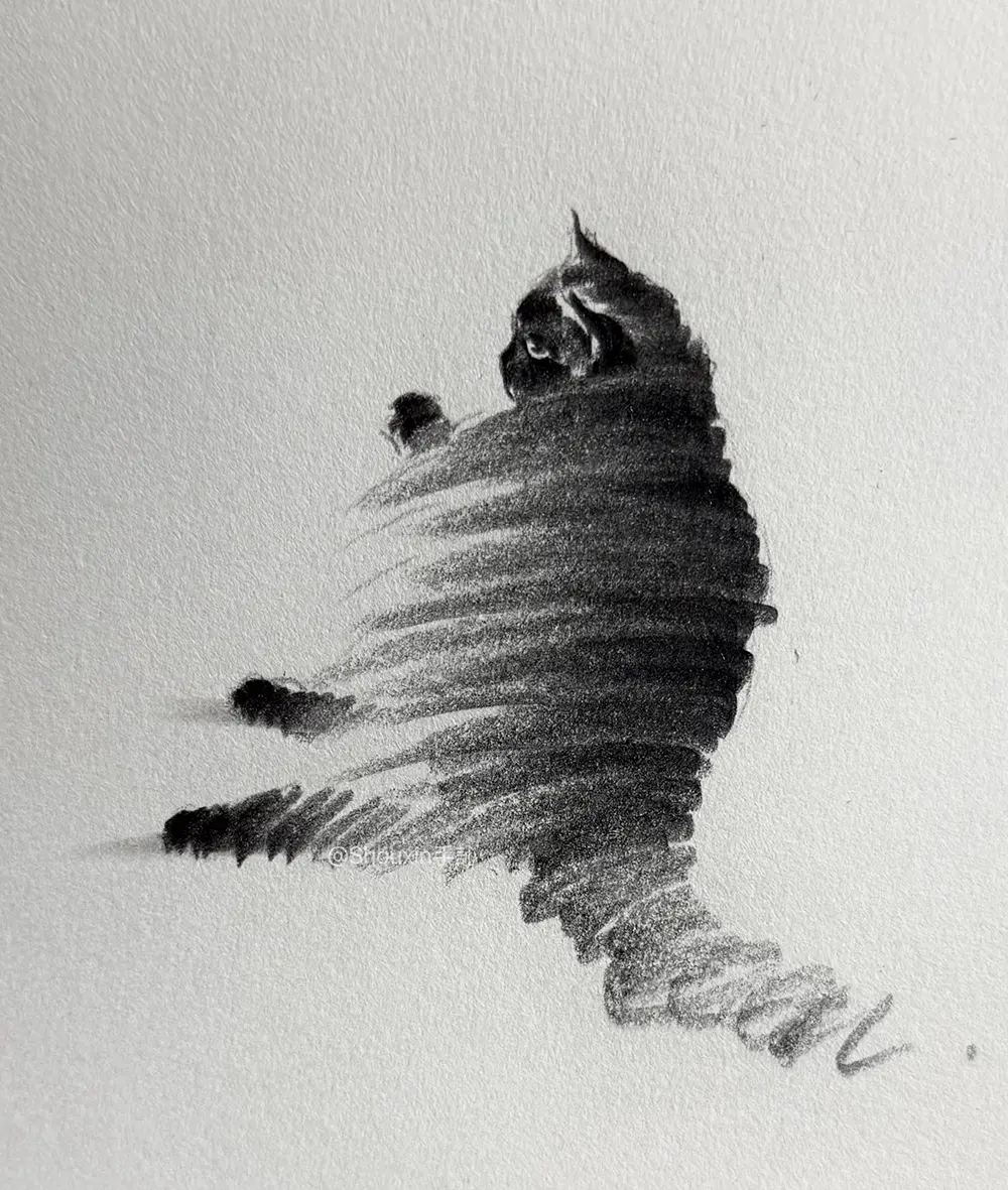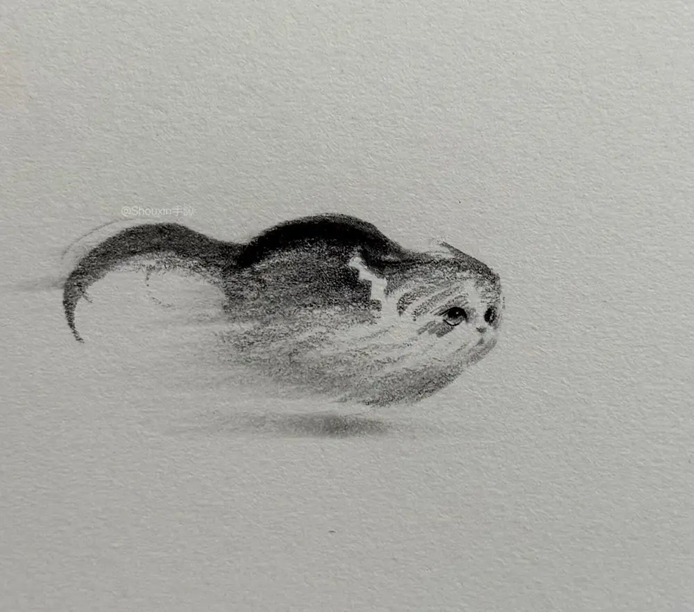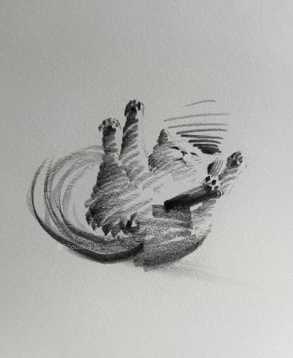 With just a few confident strokes of graphite, artist ShouXin manages to capture the spirit of cats in motion. His drawings are full of energy and humor, showing felines that leap, roll, crash, and tumble with endless curiosity. Instead of overworking every detail, ShouXin focuses on what matters most: the spark of personality in each cat.