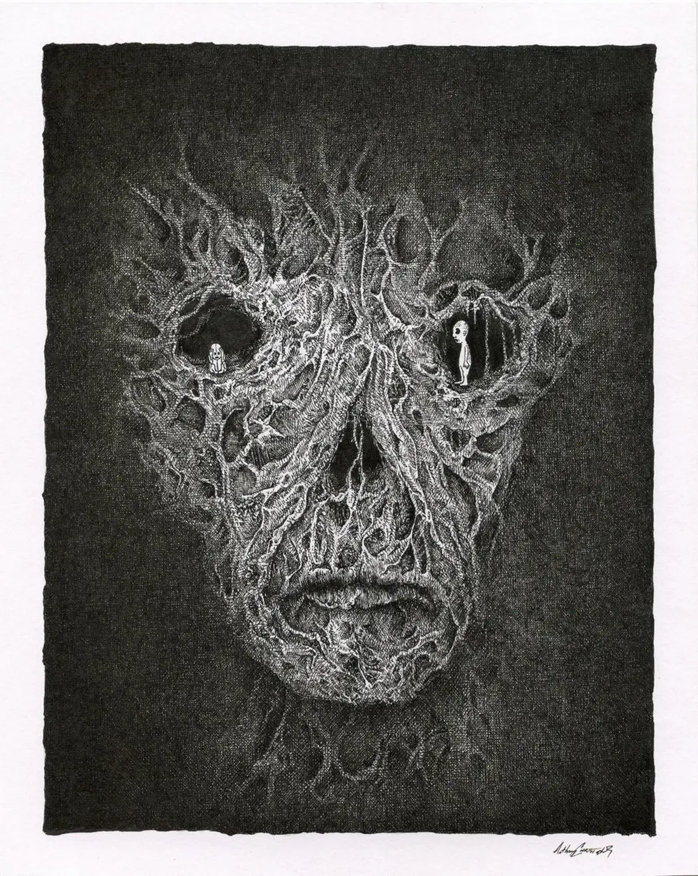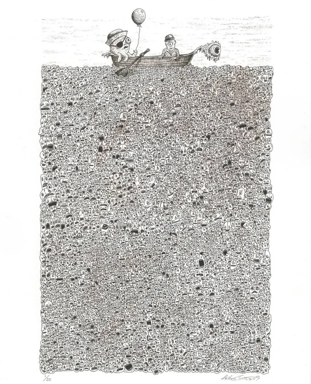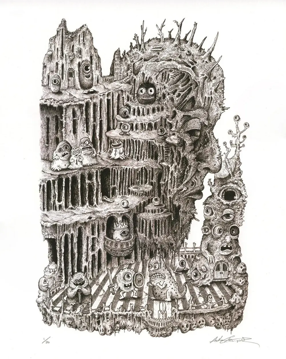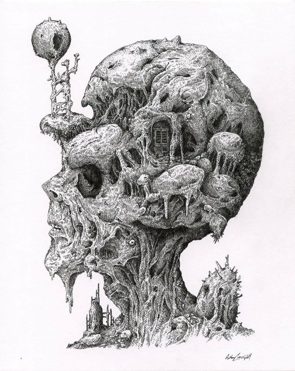 What’s really cool is how he turns personal feelings into art. Ever felt socially drained or just completely overwhelmed by the world? You’ll see that reflected in his chaotic line work. His pen and ink surreal drawings feel like a peek into a fever dream that is both dark and strangely relatable. Whether he’s working on tiny sketchbook pages or massive illustrations, Anthony’s dedication to the grind is legendary. If you love art that makes you squint and stare for twenty minutes just to see what’s hiding in the corner, you’ve found your new favorite artist.