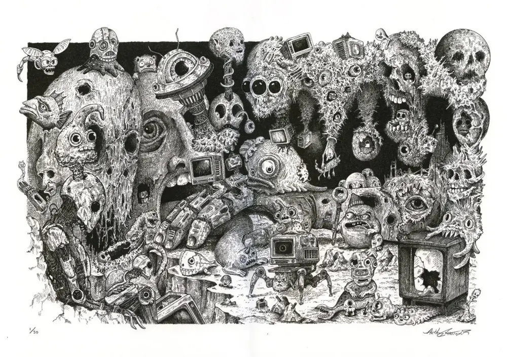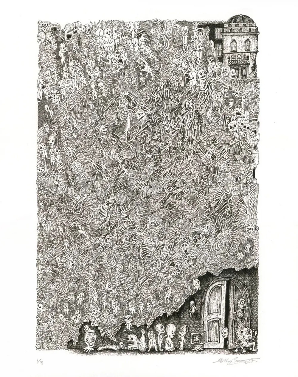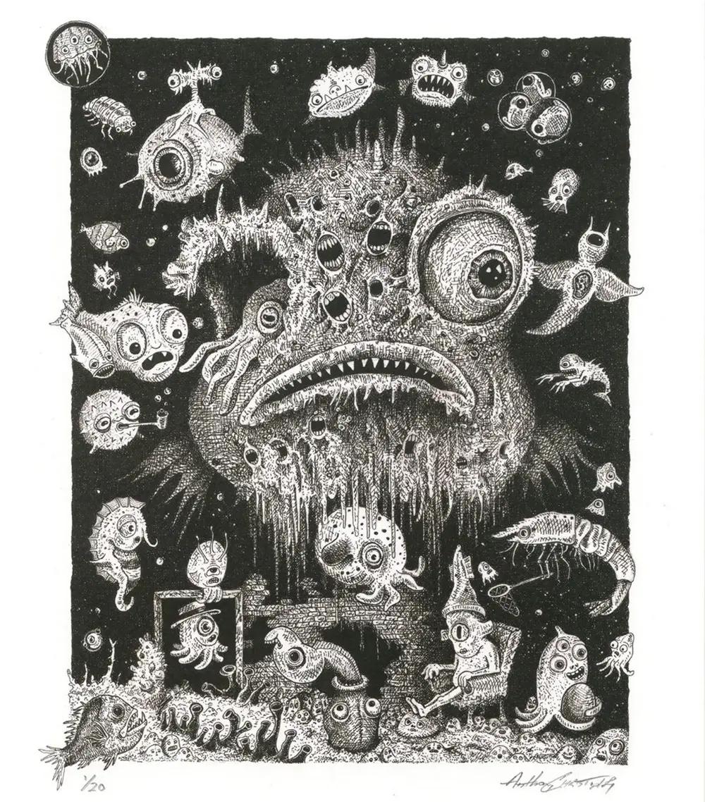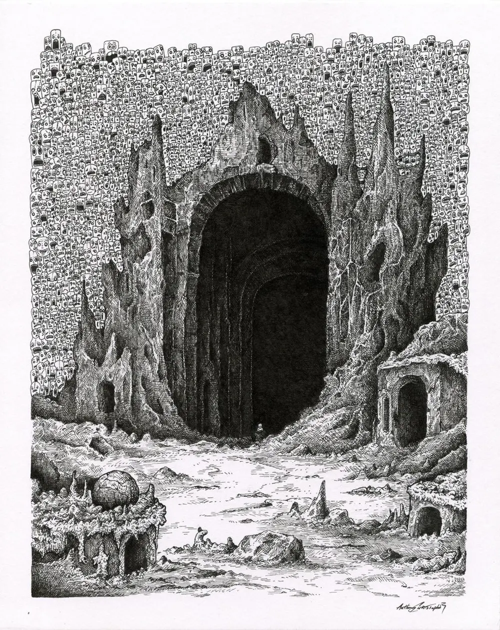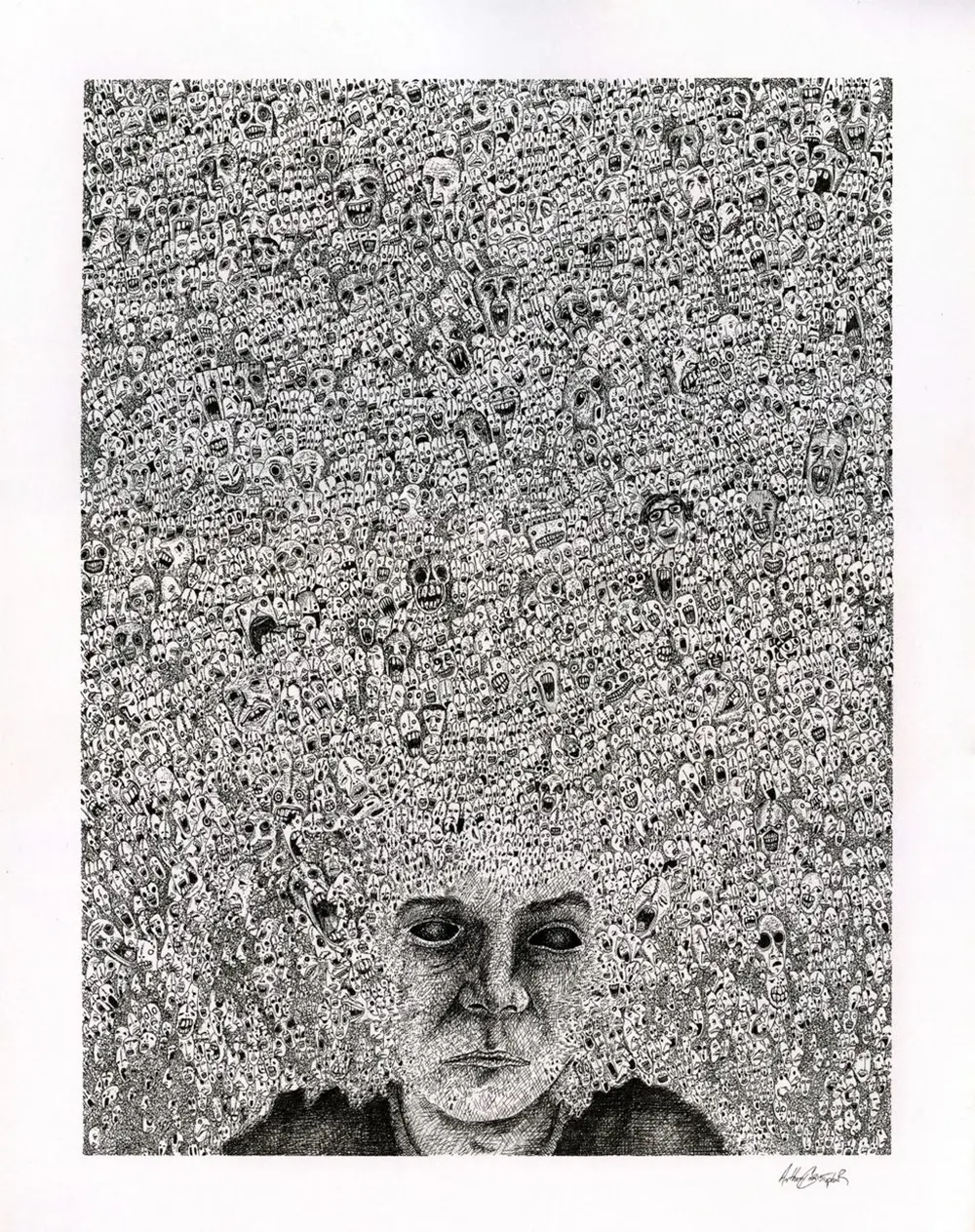 What’s really cool is how he turns personal feelings into art. Ever felt socially drained or just completely overwhelmed by the world? You’ll see that reflected in his chaotic line work. His pen and ink surreal drawings feel like a peek into a fever dream that is both dark and strangely relatable. Whether he’s working on tiny sketchbook pages or massive illustrations, Anthony’s dedication to the grind is legendary. If you love art that makes you squint and stare for twenty minutes just to see what’s hiding in the corner, you’ve found your new favorite artist.