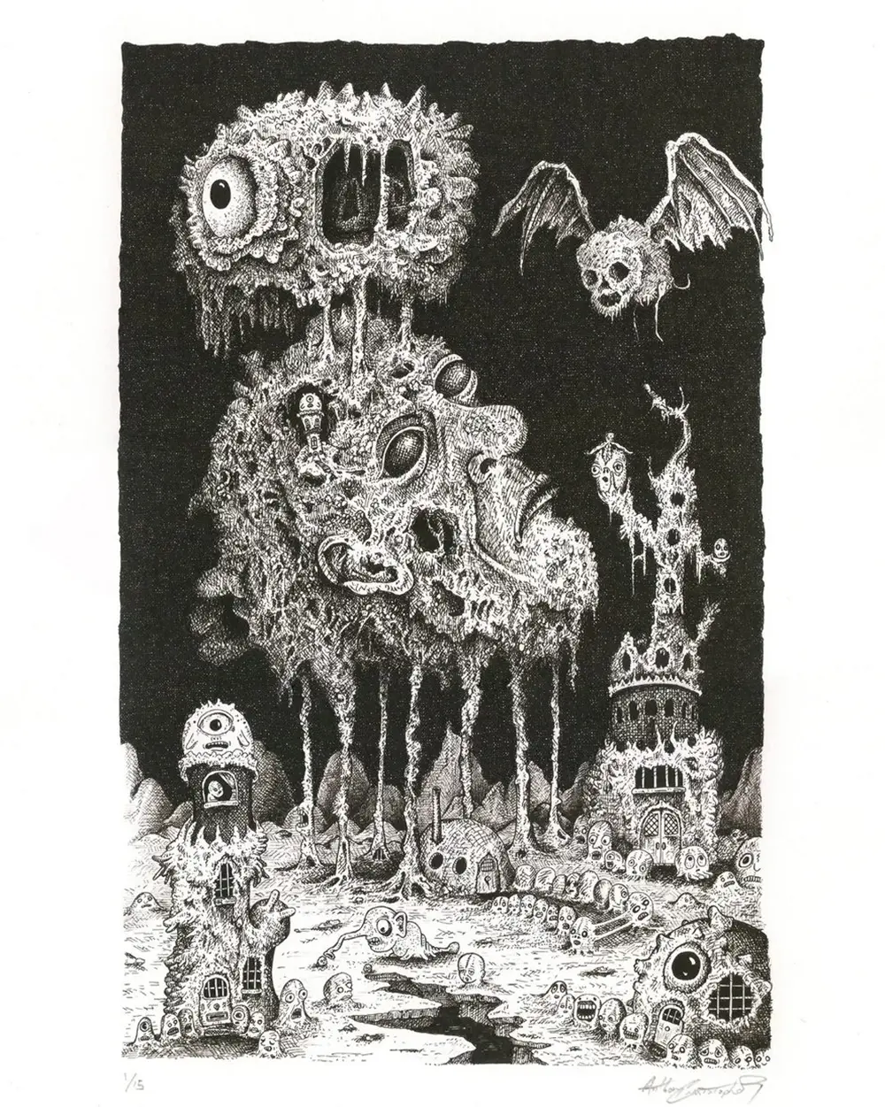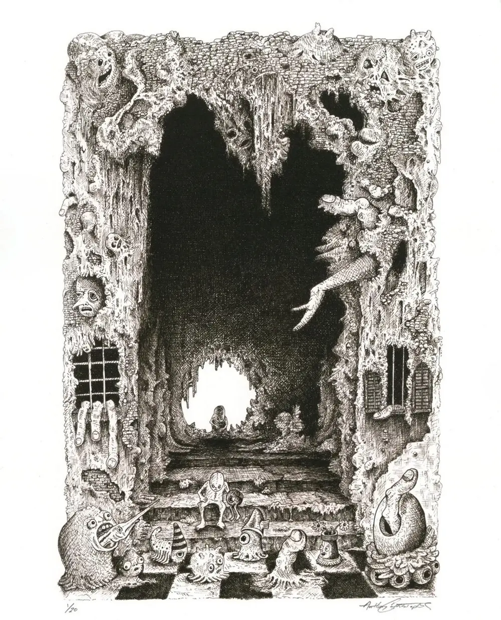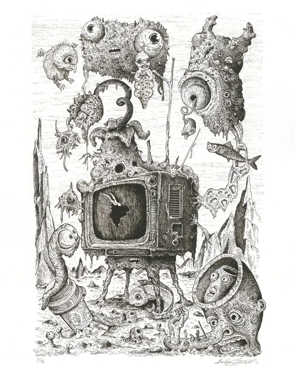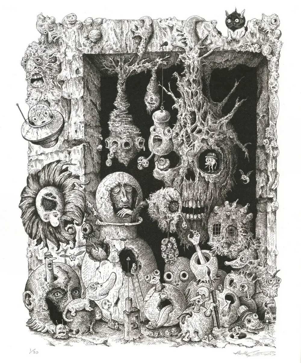 What’s really cool is how he turns personal feelings into art. Ever felt socially drained or just completely overwhelmed by the world? You’ll see that reflected in his chaotic line work. His pen and ink surreal drawings feel like a peek into a fever dream that is both dark and strangely relatable. Whether he’s working on tiny sketchbook pages or massive illustrations, Anthony’s dedication to the grind is legendary. If you love art that makes you squint and stare for twenty minutes just to see what’s hiding in the corner, you’ve found your new favorite artist.