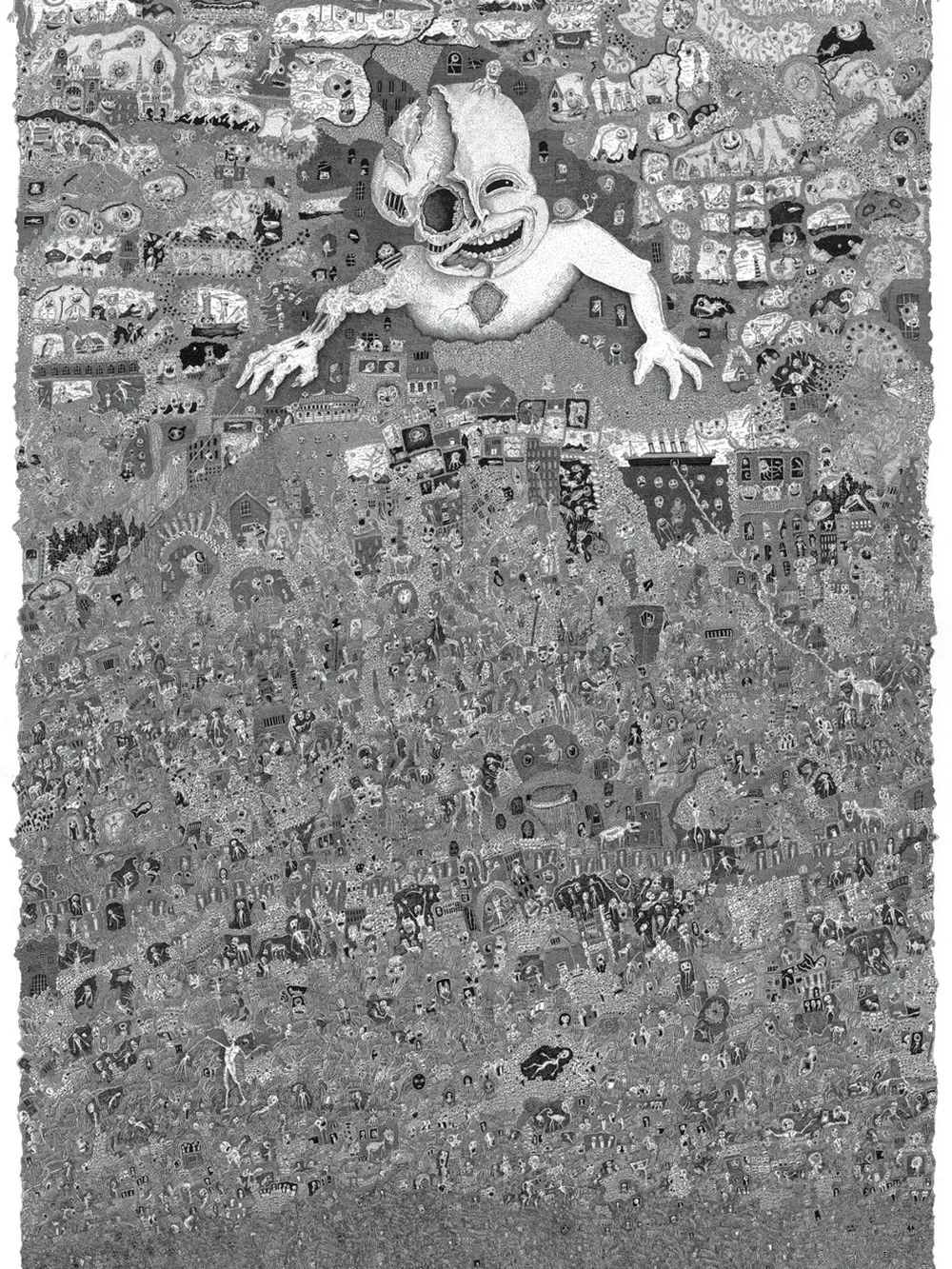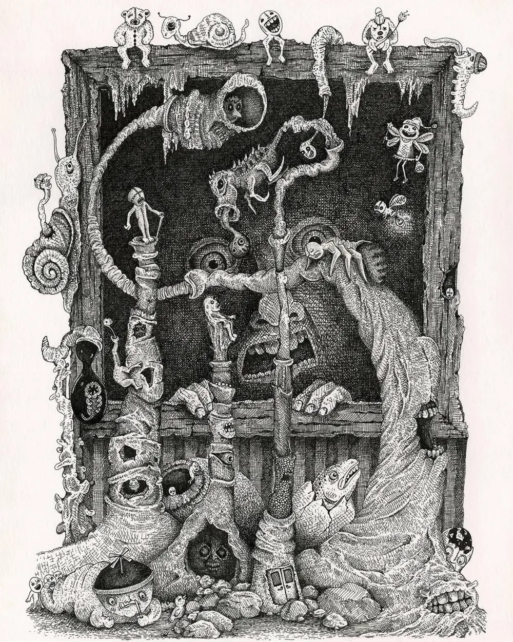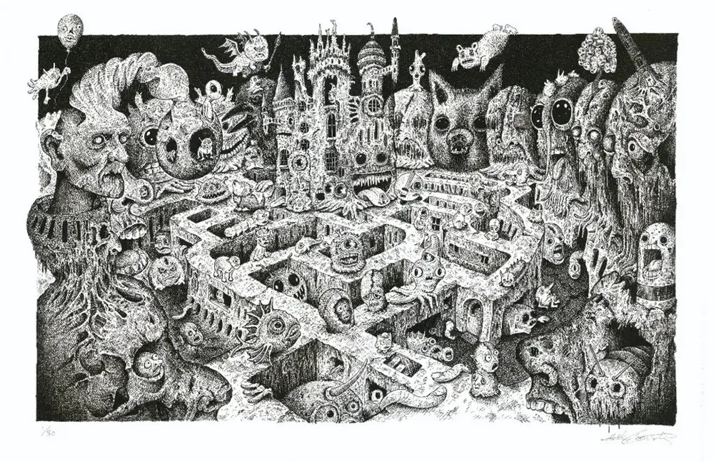 I first stumbled across his work on Instagram, and let me tell you, it’s a total rabbit hole. He’s a master of “horror vacui”—basically the fear of leaving any space white—and “wimmelbild,” which is just a fancy way of saying his art is incredibly busy and detailed. Using ultra-fine tools like the .30 Rapidograph, he populates his canvases with massive crowds of goofy, distorted, and sometimes flat-out creepy characters.