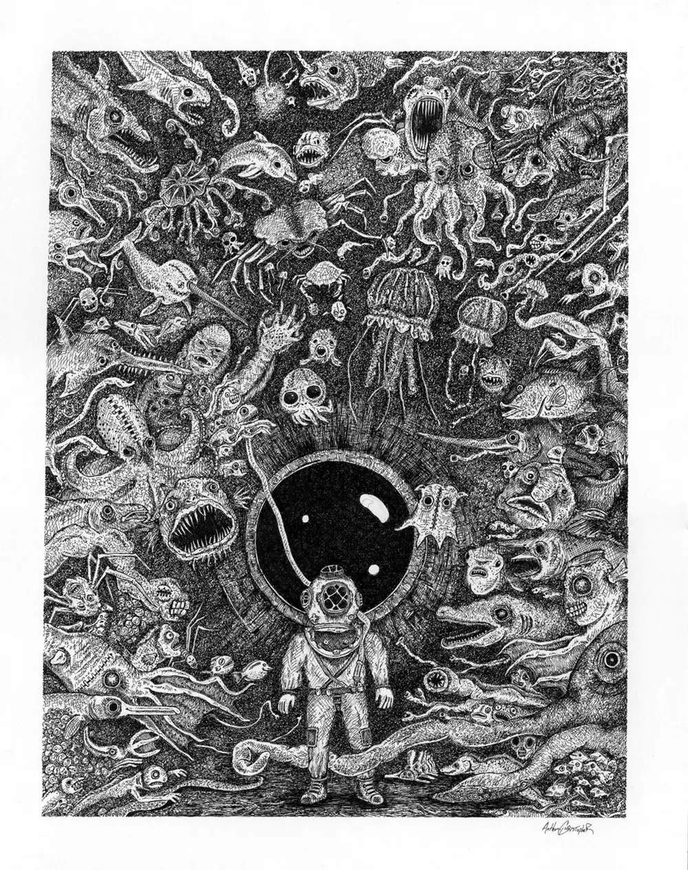 If you’ve ever looked at a blank piece of paper and felt a little intimidated, you need to check out the work of Chicago artist Anthony Christopher. This guy doesn’t just draw; he wages a full-scale war against empty space. Known for his insane pen and ink surreal drawings, Anthony creates high-contrast worlds where every single millimeter is packed with a tiny, often bizarre, story.