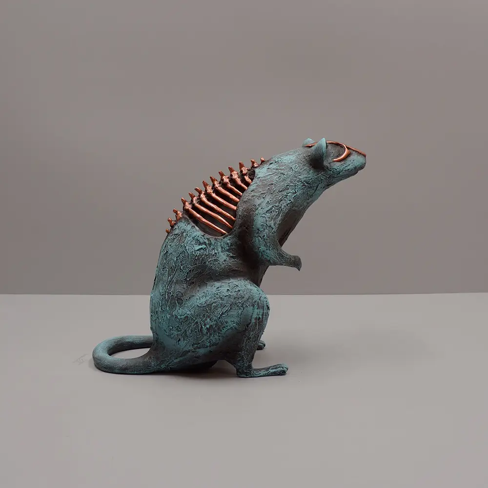 What makes her sculptures even more captivating is her use of cold porcelain combined with copper-like finishes. This mix gives her creations a unique texture—delicate yet powerful, fragile yet timeless. The surfaces shimmer with metallic tones, enhancing the sense that these beings are artifacts from another world.