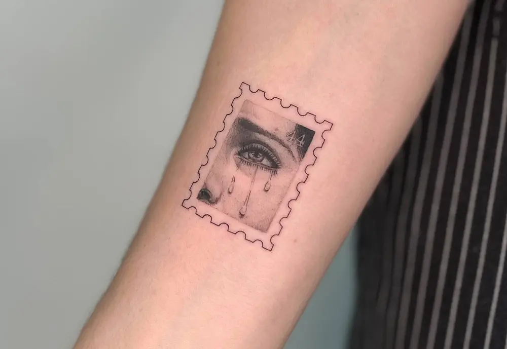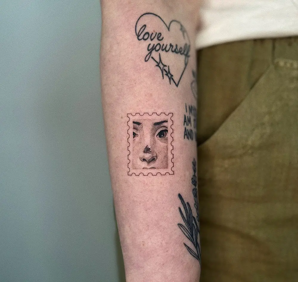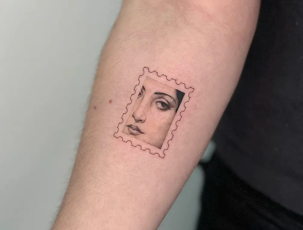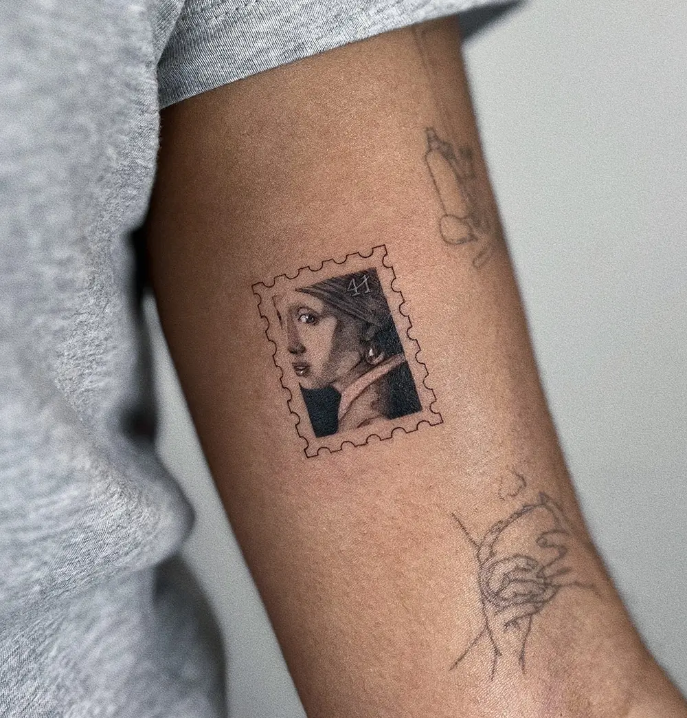 Using fine line techniques and delicate shading, Aurich transforms miniature tattoos into tiny masterpiece tattoos, often inspired by Renaissance and Baroque art. Each piece is framed by the scalloped edges of a postage stamp, making it look like a collectible work of art.