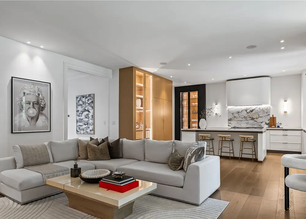 The living area sets the tone immediately. A generous sectional anchors the room, low and relaxed, wrapped in warm neutrals that feel calming rather than cold. Natural wood floors run uninterrupted, guiding your eye toward the kitchen without breaking the flow. Even the lighting feels intentional. Subtle, layered, and never overpowering. Nothing is competing for attention here, and that restraint is exactly what makes the space feel so composed.