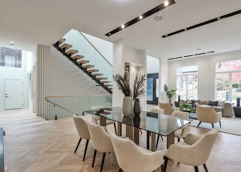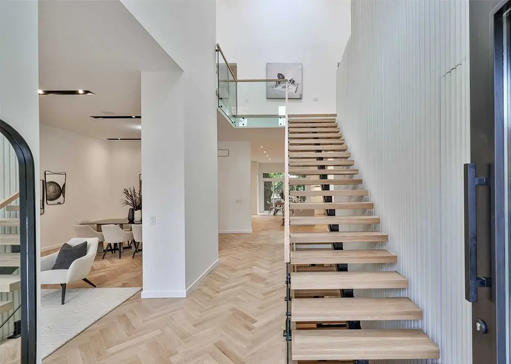 Then there’s the staircase, easily one of the most striking features in the home. Floating wood treads paired with slim black supports and glass railings give it a sense of lightness that feels architectural rather than purely functional. It doesn’t block light or interrupt sightlines. Instead, it becomes part of the home’s natural rhythm, guiding movement upward while keeping the space open and calm. It’s a design choice rooted in flow, not formality.