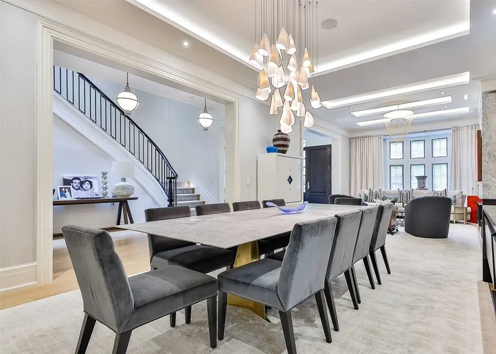 The dining area carries this same sense of ease. Sculptural lighting draws the eye upward, while soft upholstered chairs keep the space grounded and comfortable. It feels refined enough for gatherings, yet relaxed enough for everyday meals. There’s no single moment designed to steal the spotlight. Instead, there’s a steady feeling that every element belongs exactly where it is.